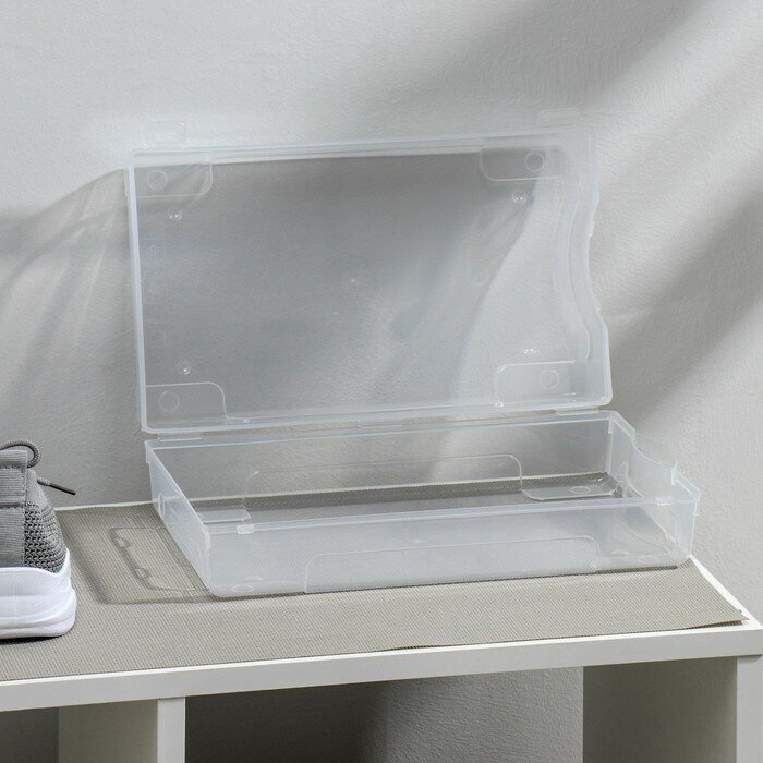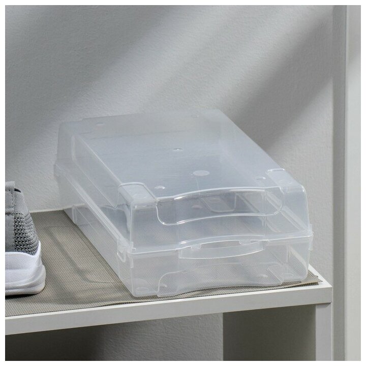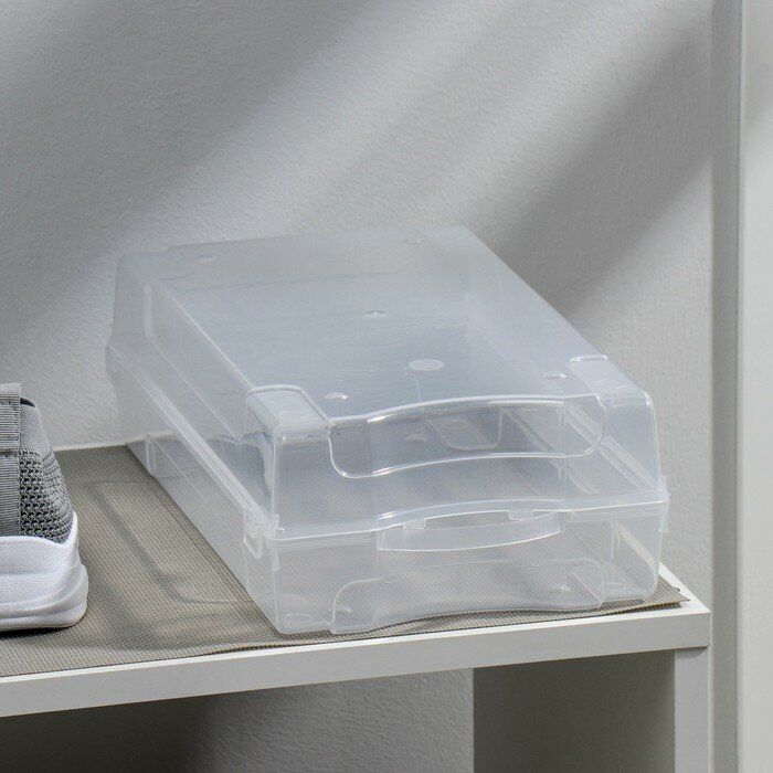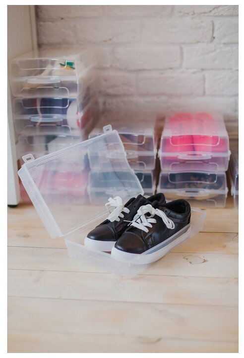Коробка для хранения обуви, полупрозрачный пластик позволяет легко найти нужную пару. Коробки снабжены технологическим отверстием для проветривания обуви. Крышка у коробки откидная, её рифлёная поверхность препятствует скольжению, облегчая вертикальное хранение. Коробка легко собирается и разбирается, в разобранном виде очень компактна. Прекрасно подходит для хранения мужской, женской и детской обуви.