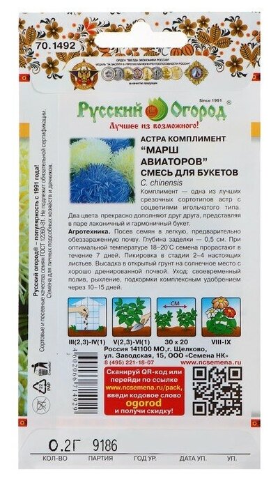 Данные семена астры Комплимент "Марш авиаторов" купила неделю назад. В конце мая буду сеять на рассаду, чтоб зацвели пораньше. На ощупь семян в пакете немного (0,2 го). Семена свежие, расфасованные в январе 2022. Срок годности 4 года с даты упаковки. Астры из серии Комплимент всегда прекрасны и подходят для букетов. Рекомендую.