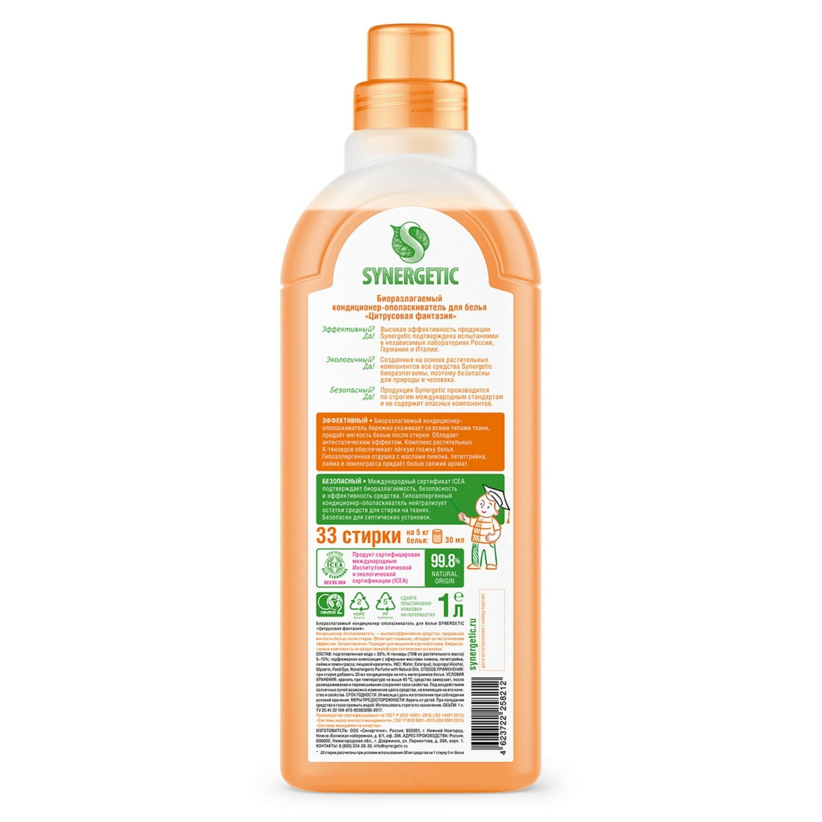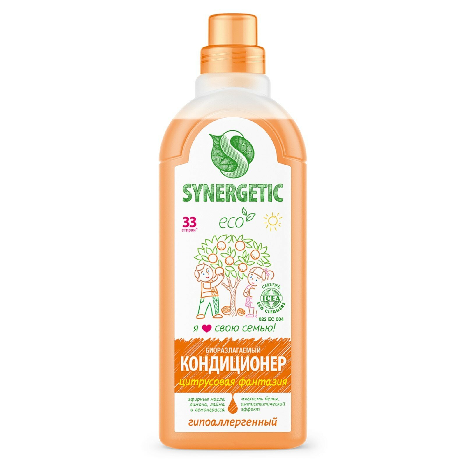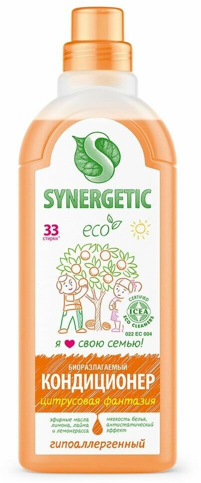 Гипоаллергенный кондиционер-ополаскиватель для белья SYNERGETIC Цитрусовая фантазия высокоэффективное средство, бережно ухаживающее за всеми типами ткани и придающее особую мягкость белью после стирки. Обладает антистатическим эффектом. Комплекс растительных К-тензидов обеспечивает легкую глажку белья. Гипоаллергенная отдушка с маслами лимона, петитгрейна, лайма и лемонграсса придаёт белью нежный аромат. Подходит для ручной и машинной стирки, полностью выполаскивается из тканей. Международный экологический сертификат ICEA подтверждает биоразлагаемость, безопасность и эффективность средства. Гипоаллергенный кондиционер-ополаскиватель нейтрализует остатки средств для стирки на тканях. Безопасен для септических установок.