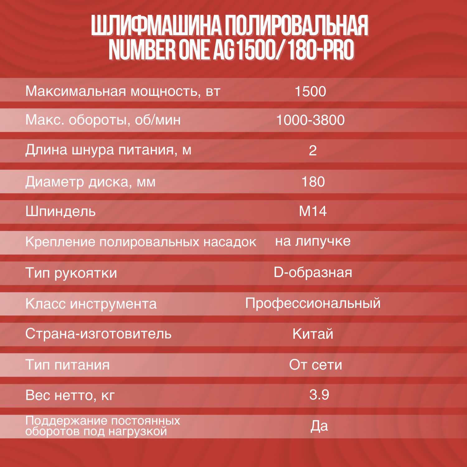 Полировальная машина угловая Number One AG1500/180 PRO, диск 180 мм, 1500 Вт., шлифмашина полировальная с электронной регулировкой оборотов 1000-3900 об/мин., сетевая. Многофункциональная полировальная машина Number One AG1500/180 PRO относится к классу полупрофессиональных устройств и отличается отличным качеством сборки, и расширенным набором характеристик. Шлифмашина предназначена для финишного шлифования и полирования различных поверхностей: металл, дерево, стекло, полимерных и прочих покрытий. Также устройство подходит для полировки автомобиля!