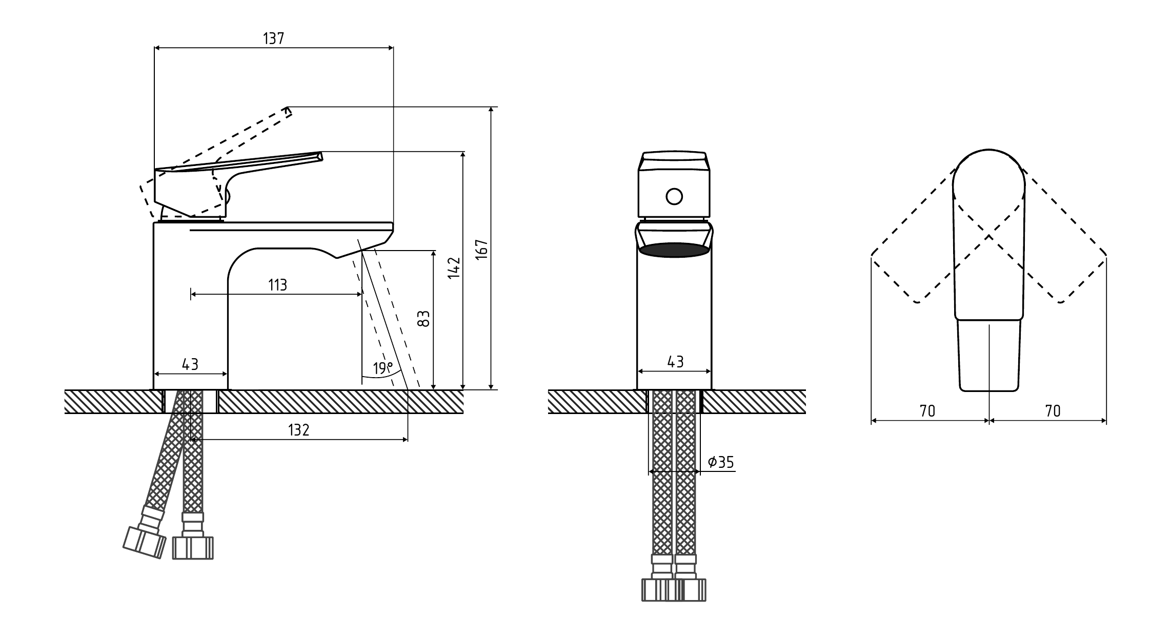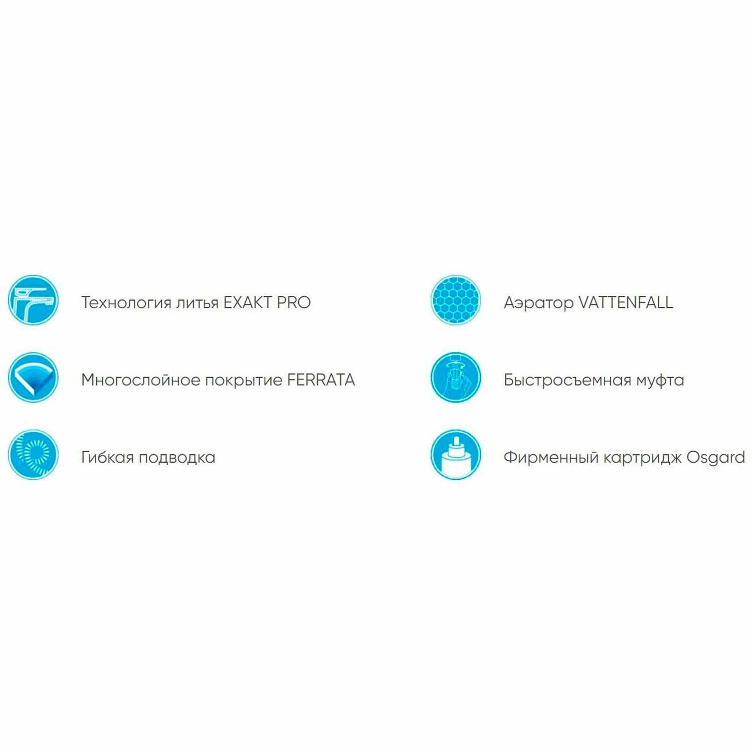 - Комплектация: смеситель 1 шт., гибкая подводка 1 компл., паспорт изделия 1 шт., крепеж 1 компл.