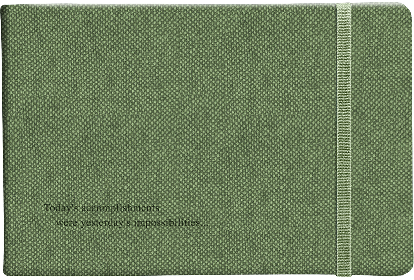 Обложка - твердая с резинкой, из преплетного материала с фактурой меланжевой рогожки, цвет - зеленый. Блок - датированный, 128 стр., скругленные уголки, 1 ляссе, бумага: слоновая кость, скругленные уголки, 70 г/м2, печать 2+2. Особенности: ляссе и резинка в цвет основного материала, блинтовое тиснение, прокрас блока в цвет основного материала.