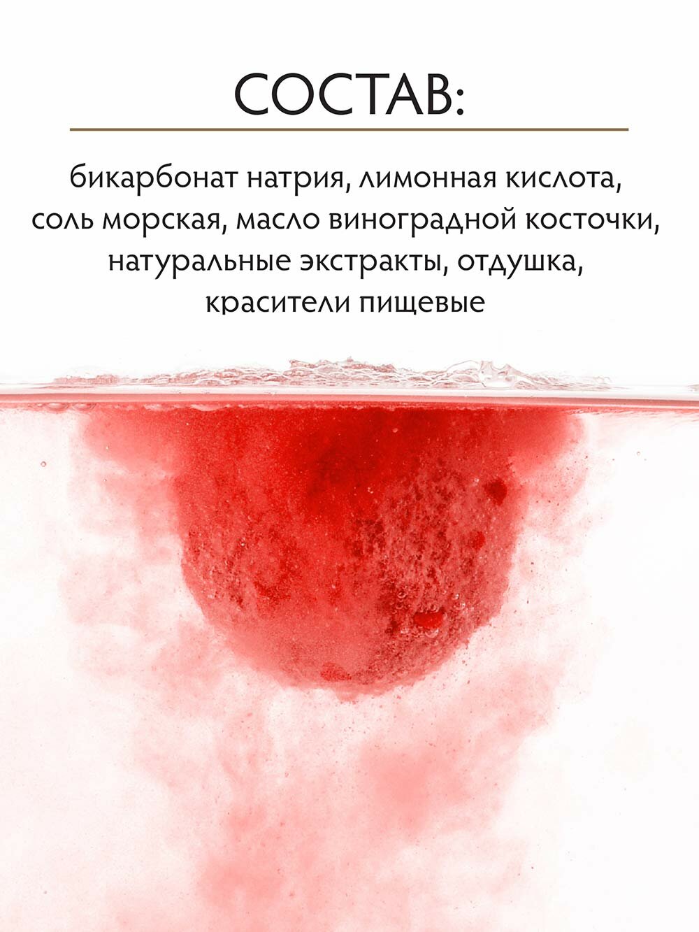 | Состав | бикарбонат натрия, лимонная кислота, соль морская, масло виноградной косточки, натуральные экстракты, отдушка, красители пищевые |