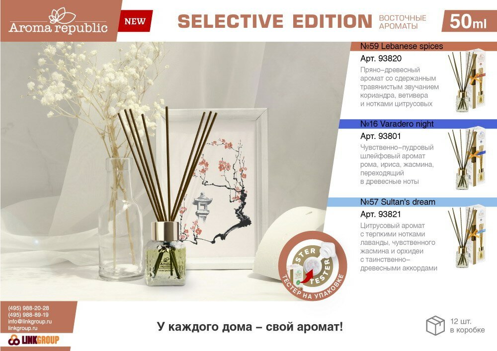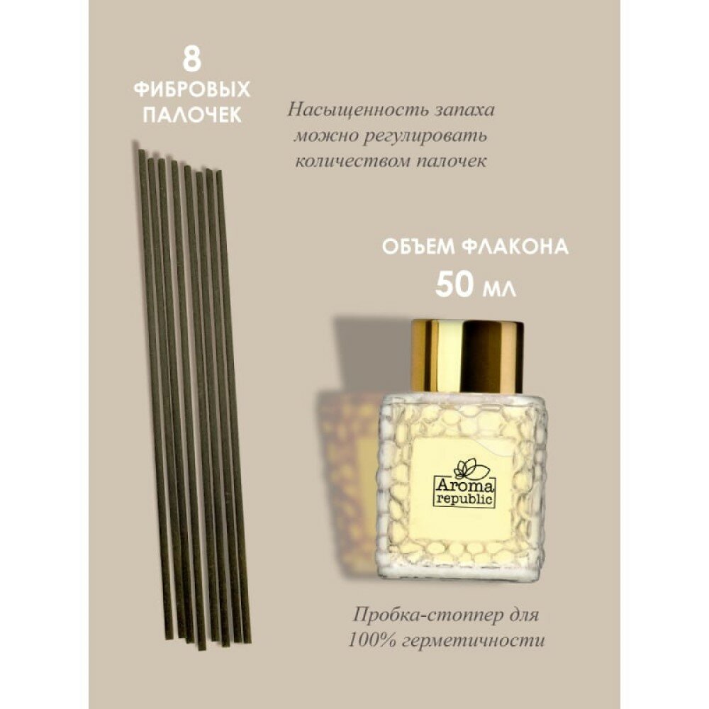 Диффузор для дома с палочками 50 мл. Создайте неповторимую атмосферу с духами для дома Aroma Republic . Чувственно-пудровый шлейфовый аромат рома, ириса, жасмина, переходящий в древесные ноты уда. Ароматизатор для дома, парфюм для дома по мотивам популярных духов. Ароматический диффузор - полезный аксессуар для дома. Домашний парфюм от AROMA REPUBLIC - качественный, стойкий, универсальный. Аромадиффузор с палочками подчеркнет дизайн интерьера, создаст ощущение комфорта. Ароматный освежитель для дома с палочками воздуха подарит гармонию и вдохновение, поделится приятными эмоциями. К нему хочется прикасаться, его хочется обонять весь день. Аромадифузор это отличный способ наслаждаться любимыми расслабляющими или поднимающими настроение ароматами, отдыхая у себя дома. Парфюмированный диффузор в стильном дизайне с фибровыми палочками – прекрасный оригинальный презент сюрприз ароматный подарок на любой праздник, для особого, торжественного случая, для любимой женщины, девушки, жены, мамы, сестры, подруги, родного мужчины, мужа, парня, брата, отца, сына, друга, для близких и дорогих людей. Такой оригинальный подарок, как диффузор с ароматическими палочками, обязательно понравится женщине или мужчине и не оставит равнодушными.Интенсивность испарения можно регулировать количеством одновременно вставленных в диффузор палочек (чем больше палочек, тем интенсивнее испарение деффузор, чем меньше палочек, тем выше экономия аромамасел аромодиффузор). Диффузор для духов сделан вручную из сырья самого высокого качества. Аромо палочки также облегчат и наполнят атмосферой праздника ваши трудовые будни. Диффузор ароматический многофункциональный, его можно использовать в ванне, на кухне, в зале или спальне. Ароматизатор для комнаты выполнен в минималистичном стиле, ароматизатор с палочками имеет мягкие и насыщенные ароматы. Духи для дома с палочками для развития работоспособности в офисе и создания атмосферы радости и чистоты в вашей гостиной, отличный декор для дома и уюта. Фибровые палочки позволяют аромату для воздуха сохранять стойкость на протяжении всего срока действия. Аромадиффузер AROMA REPUBLIC - это оригинальные масла из Франции (вода парфюмерная). Ароматизатор в любом месте где он находится, создаст приятный запах для дома. Он освежает воздух, создаёт атмосферу комфорта и спокойствия.