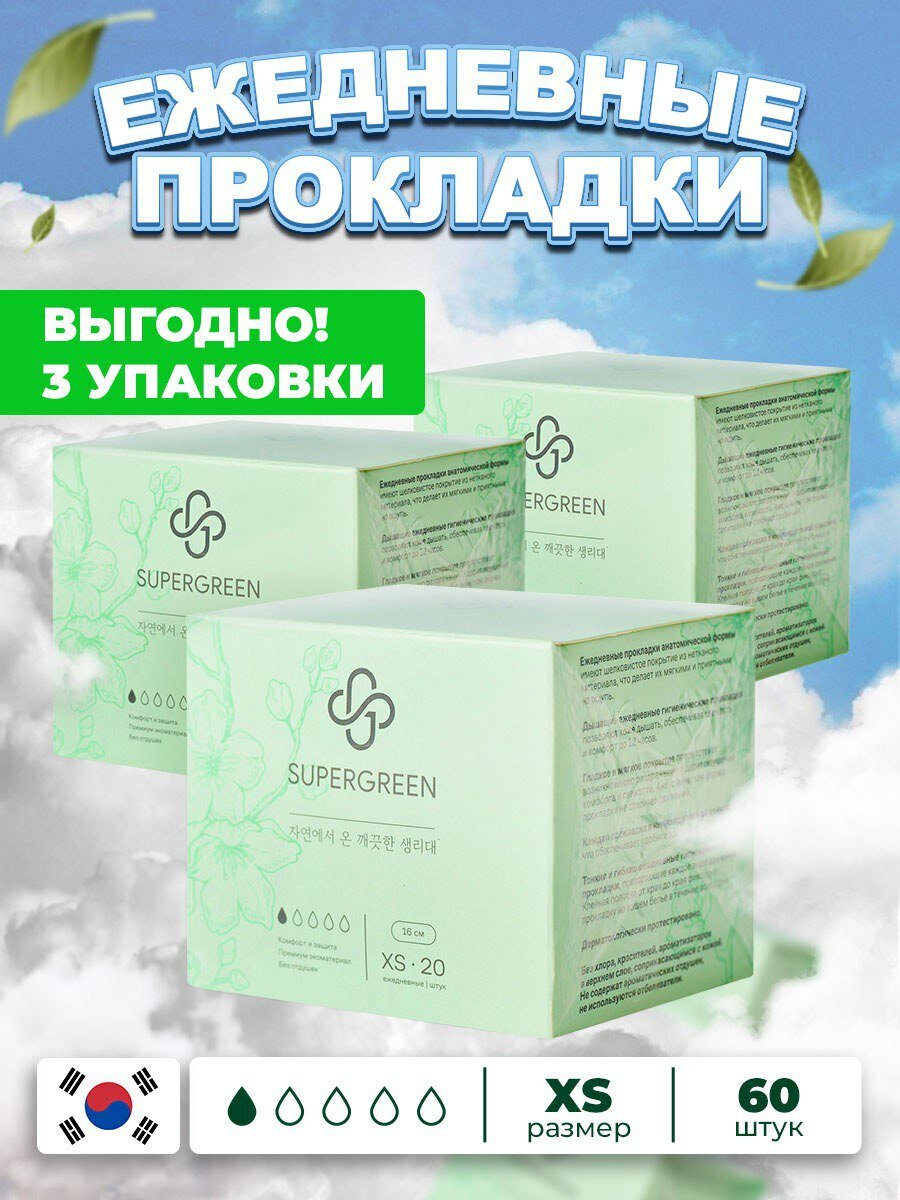 Женские ежедневные прокладки анатомической формы SUPERGREEN (без крылышек), имеют шелковистое покрытие из нетканого материала, что делает их мягкими и приятными на ощупь. Разработано в Корее.Воздухопроницаемый задний слой обеспечивает ощущение свежести и необходимую вентиляцию во время использования. Каналы контроля против протекания. Прокладки обеспечивают идеальную защиту для обильных критических дней, углубление в прокладке помогает менструальным выделениям быстрее попадать в абсорбирующую сердцевину.Быстрая впитывающая способность, благодаря суперабсорбенту Sumitomo SAP. Сырье для ультратонкой впитывающей бумаги импортируется из США. Надежная защита от боковой утечки нетканый материал предотвращает утечку с двух сторон.Дерматологически протестировано. Без хлора, красителей, ароматизаторов в верхнем слое, соприкасающемся с кожей. Не содержат ароматических отдушек, не используются отбеливатели.Способ применения: снять защитный слой, прикрепить к белью, использовать однократно.Условия хранения: хранить в недоступных для детей местах, защищенных от влаги и прямых солнечных лучей. Утилизация: после использования не выбрасывать в канализацию или в унитаз. Использованную прокладку рекомендуется обернуть в обертку от новой, если ее нет, то в туалетную бумагу и в таком виде выбросить в мусорное ведро.Номер партии указан на упаковке. Срок новости: 36 месяцев с даты производства. Дата производства указана на упаковке.Товар соответствует ГОСТ Р52483-2020 Прокладки (пакеты) женские гигиенические. Декларация о соответствии № РОСС RU Д-KR. PA01. B.39362/22 от 31.10.2022г