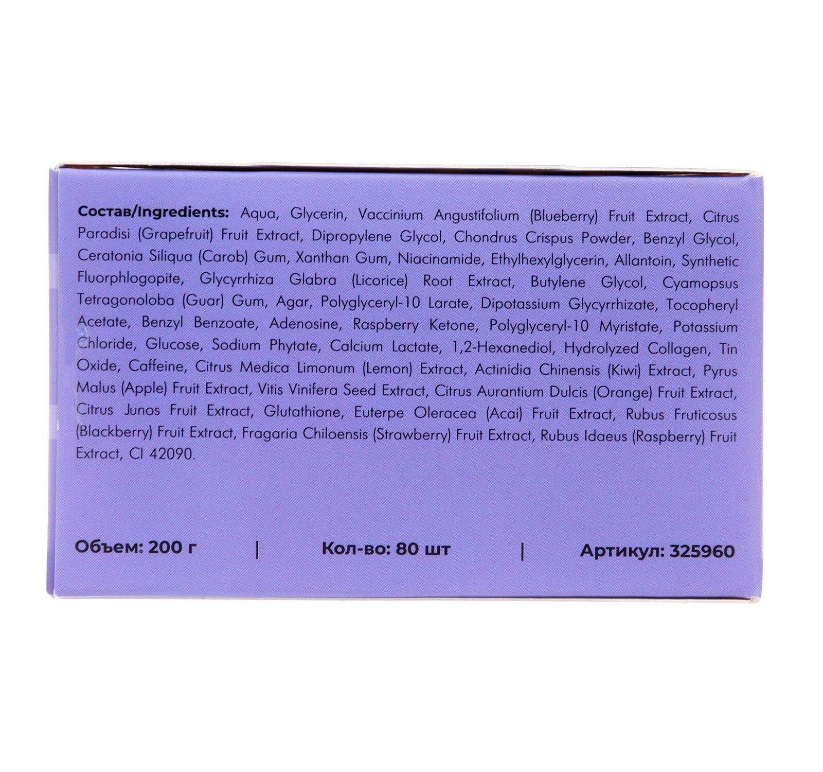 | Химический состав | Aqua, Glycerin, Vaccinium Angustifolium (Blueberry) Fruit Extract, Citrus Paradisi (Grapefruit) Fruit Extract, Dipropylene Glycol, Chondrus Crispus Powder, Benzyl Glycol, Ceratonia Siliqua (Carob) Gum, Xanthan Gum, Niacinamide, Ethylhexylglycerin, Allantoin, Synthetic Fluorphlogopite, Glycyrrhiza Uralensis (Licorice) Root Extract, Butylene Glycol, Cyamopsus Tetragonoloba (guar) Gum, Agar, Polyglyceryl-10 Larate, Dipotassium Glycyrrhizate, Tocopheryl Acetate, Benzyl Benzoate, Adenosine, Raspberry Ketone, Polyglyceryl-10 Myristate, Potassium Chloride, Glucose, Sodium Phytate, Calcium Lactate, 1,2-Hexanediol, Hydrolyzed Collagen, Tin Oxide, Caffeine, Citrus Limon (Lemon Fruit Extract, Actinidia Chinensis (Kiwi) Fruit Extract, Pyrus Malus (Apple) Fruit Extract, Vitis Vinifera (Grape) Fruit Extract, Citrus Aurantium Dulcis (Orange) Fruit Extract, Citrus Junos Fruit Extract, Glutathione, Euterpe Oleracea Fruit Extract, Rubus Fruticosus (Blackberry) Fruit Extract, Fragaria Chiloensis (Strawberry) Fruit Extract, Rubus Idaeus (Raspberry) Fruit Extract, CI 42090. |