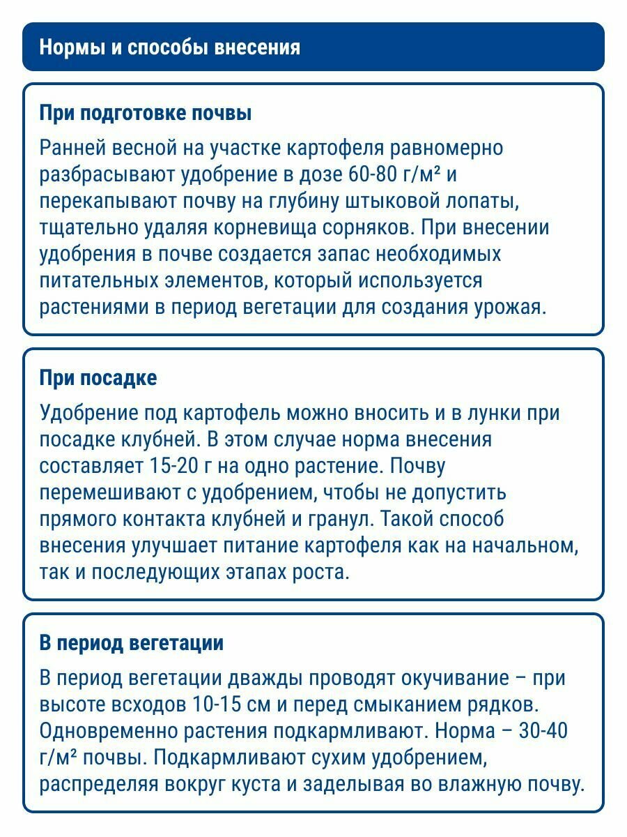 Удобрение вносят весной при перекопке огорода или в лунки при посадке картофеля. Возможна дополнительная подкормка при окучивании.