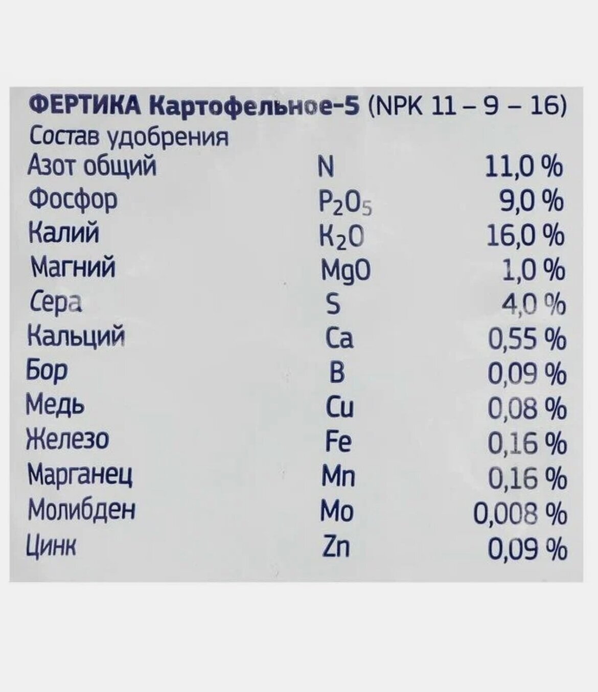 | Состав | азот (N) – 11%; оксид фосфора (P2O5) – 9%; оксид калия (K2O) – 16%; оксид магния (MgO) – 1%; сера (S) – 4%; кальций (Ca) – 0.55%; бор (B) – 0.09%; медь (Cu) – 0.08%; марганец (Mn) – 0.16% |