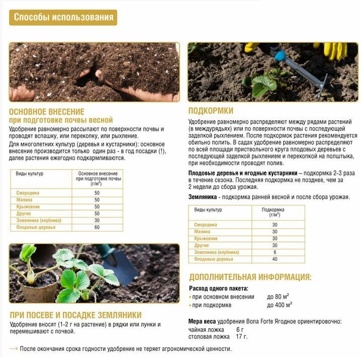 | Способ применения | Основное внесение (при подготовке почвы весной) – удобрение равномерно рассыпают по поверхности почвы и проводят вспашку, или перекопку, или рыхление. Для многолетних культур (деревья и кустарники): основное внесение производится только один раз - в год посадки (!), далее растения ежегодно подкармливаются. При посеве и посадке земляники - удобрение вносят (1-2 г на растение) в рядки или лунки и перемешивают с почвой. Подкормки – удобрение равномерно распределяют между рядами растений (в междурядьях) или по поверхности почвы с последующей заделкой рыхлением. После подкормок растения рекомендуется обильно полить. В садах удобрение равномерно распределяют по всей площади приствольного круга плодовых деревьев с последующей заделкой рыхлением и перекопкой на полштыка, при необходимости проводят полив. |
