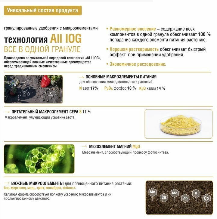 | Состав (%) | Три основных макроэлемента (NPK): азот (N) - 17 %, фосфор (P2O5) - 10%, калий (K2O) - 14 % Питательный макроэлемент сера (S): - 11 % Мезоэлемент |