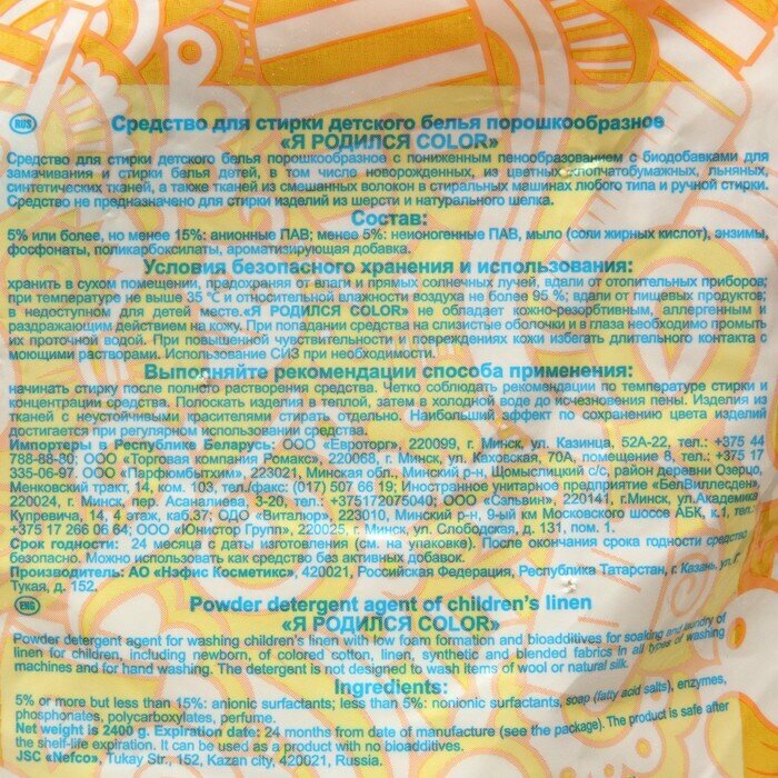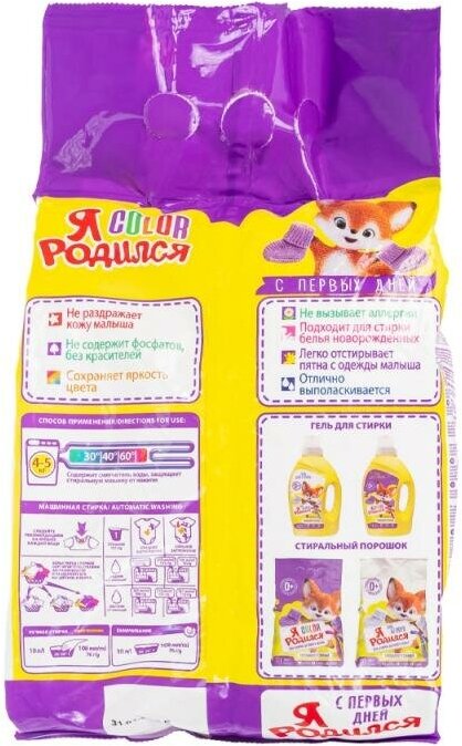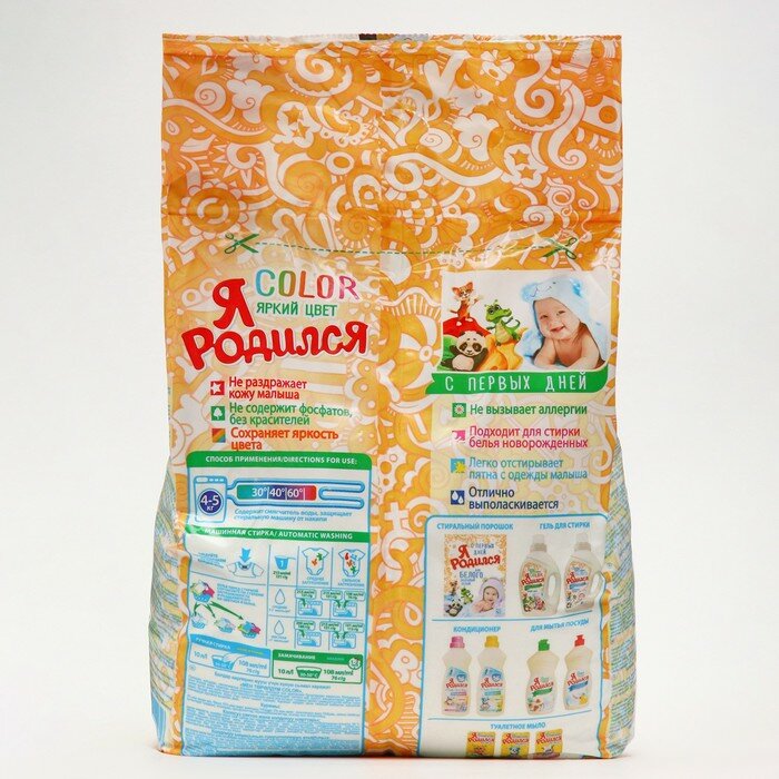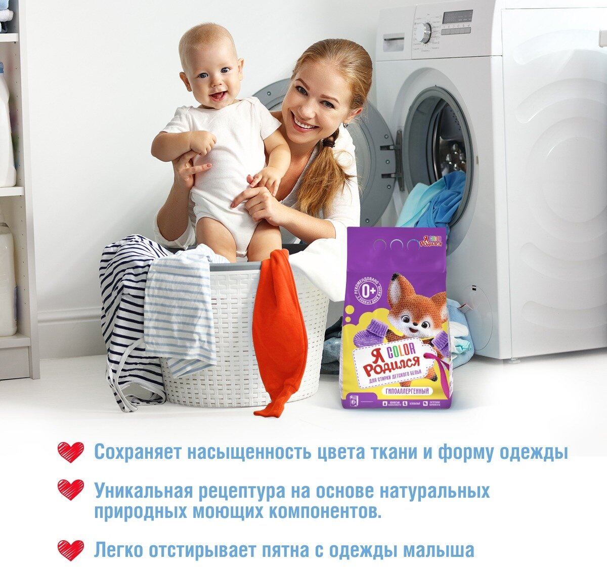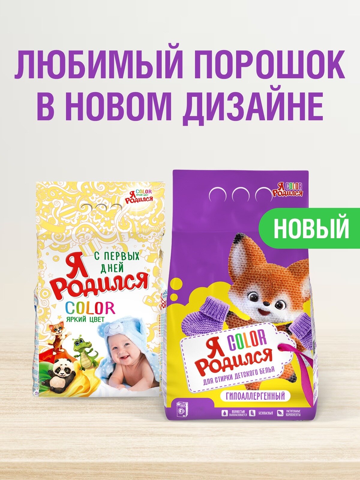 Детский стиральный порошок Я родился для цветных и темных тканей это премиальное качество для всей семьи. Отстирывает даже самые сложные пятна, отлично в том числе от фруктовых и овощных пюре, травы, чая, молока с одежды не повреждая волокна ткани, обладает нейтральным ароматом и легко выполаскивается. Порошок стиральный, так же как и гель для стирки без фосфатов, отлично выполаскивается. Не вызывает аллергии. Сохраняет яркость цвета. Универсальное: для детей и взрослых. Подходит для любого типа стиральной машины, защищает нагревательные элементы стиральной машины от накипи. Премиальная линейка средств для малышей с первых дней жизни и для всей семьи. Бесфосфатные/бесцеолитные порошки, гипоаллергенные гели для стирки, кондиционеры с натуральными экстрактами, средства для мытья посуды, овощей и фруктов с биодобавками, мыло с маслом зародышей пшеницы. Вся продукция гипоаллергенная.
