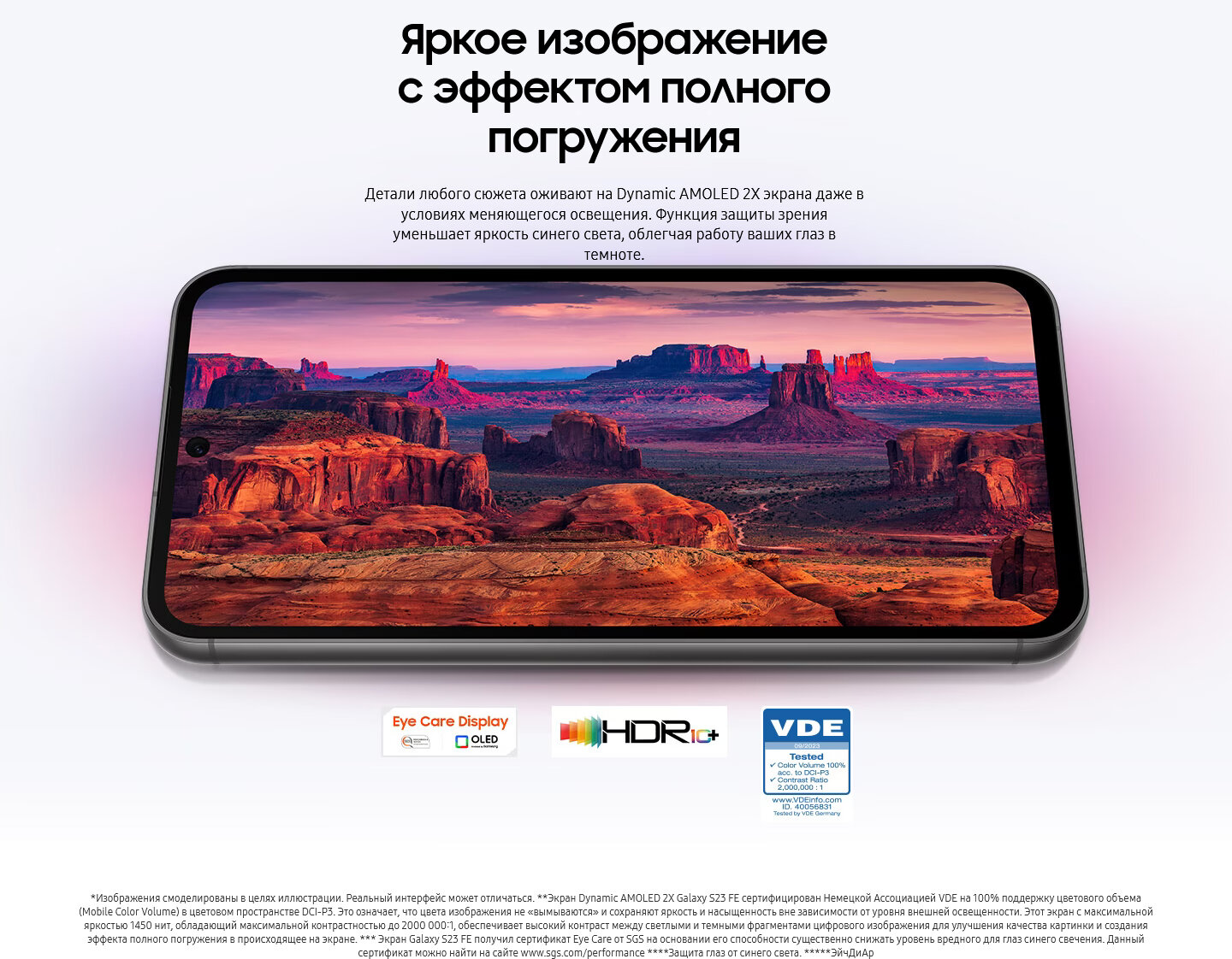 Galaxy S23 FE станет вашим проводником к незабываемым воспоминаниям благодаря аккумулятору увеличенной ёмкости и потрясающим ночным снимкам. Galaxy S23 FE унаследовал впечатляющий дизайн серии Galaxy S23, переняв его премиальную эстетику и многие свойства практичного характера. Защитное стекло Corning Gorilla Glass 5 защищает корпус смартфона спереди и сзади — будьте спокойны за его сохранность. Кроме того, Galaxy S23 FE не боится испытаний — благодаря защите от воды и пыли по стандарту IP68. Снимайте лучшие моменты жизни с помощью камеры профессионального уровня, которая с лёгкостью превращает ваши снимки в произведения искусства и днём, и ночью. Благодаря матрице с высоким разрешением ваши снимки будут отличаться высокой детализацией и чёткостью. Измените отношение к съёмке при слабом освещении — получайте яркие снимки с низким уровнем шумов. Благодаря усовершенствованной системе камер снимки получаются высокодетализированными и чёткими, независимо от того, находитесь ли вы на концерте или в других условиях с низкой освещённостью. Низкая освещённость — не помеха! Благодаря Ночному Режиму ваши видео будут плавными даже при съёмке в темноте. Сделать паузу — теперь это только ваш выбор. Аккумулятор ёмкостью 4500 мАч позволит вам играть или смотреть любимые сериалы, не прерываясь на подзарядку. Разрядился аккумулятор? Ненадолго. Подзарядите его в миг прямо на ходу. Наслаждайтесь еще более быстрой зарядкой, просто подключив смартфон к сетевому зарядному устройству для сверхбыстрой зарядки.