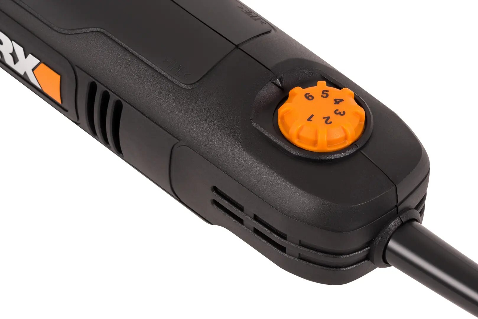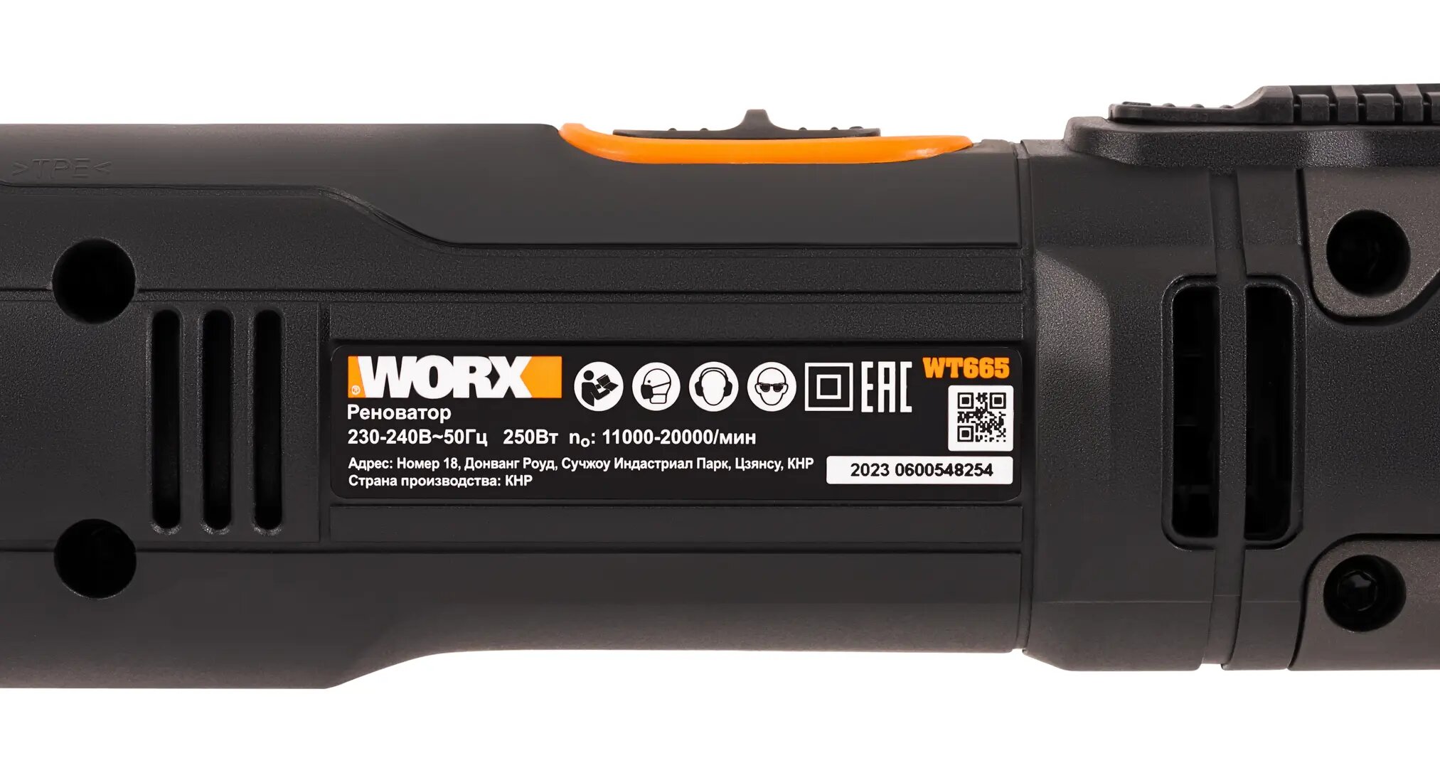 **Реноватор сетевой Worx WT665** мощностью 230 Вт — многофункциональный инструмент для выполнения резки, заточки, полировки, шлифовки, подгонки заготовок и других проектов в быту. Прибор работает от электродвигателя с угольными щетками и регулируемой скоростью вращения шпинделя (6 режимов). Частота колебаний в минуту — 11000-20000. Система крепления OIS позволяет устанавливать насадки вдоль оси корпуса и под углом в диапазоне от 0° до 360°, обеспечивая точность манипуляций в труднодоступных местах.