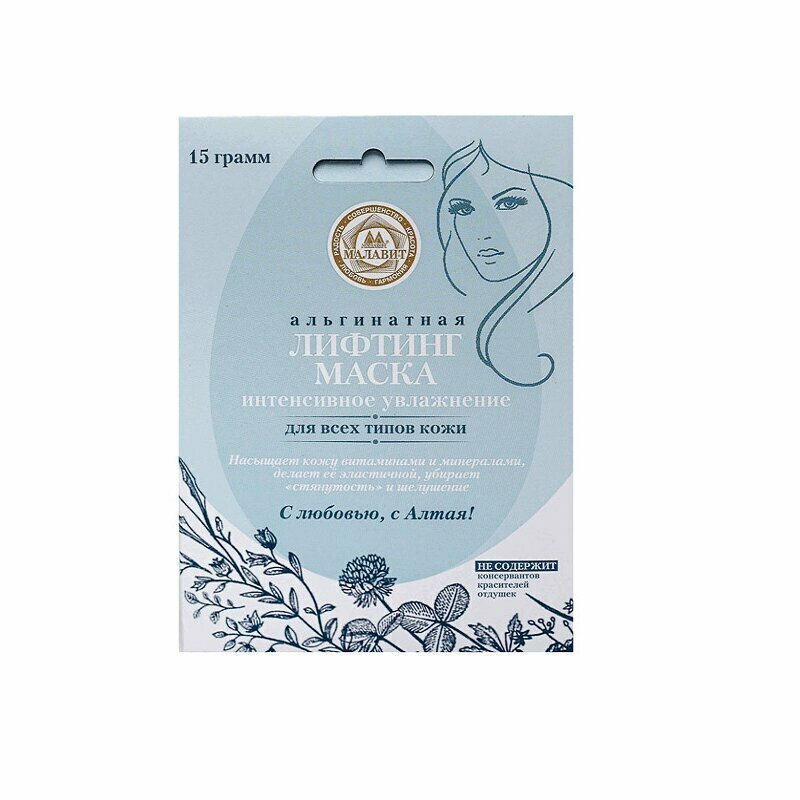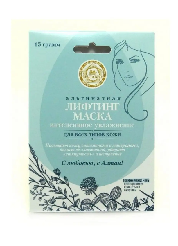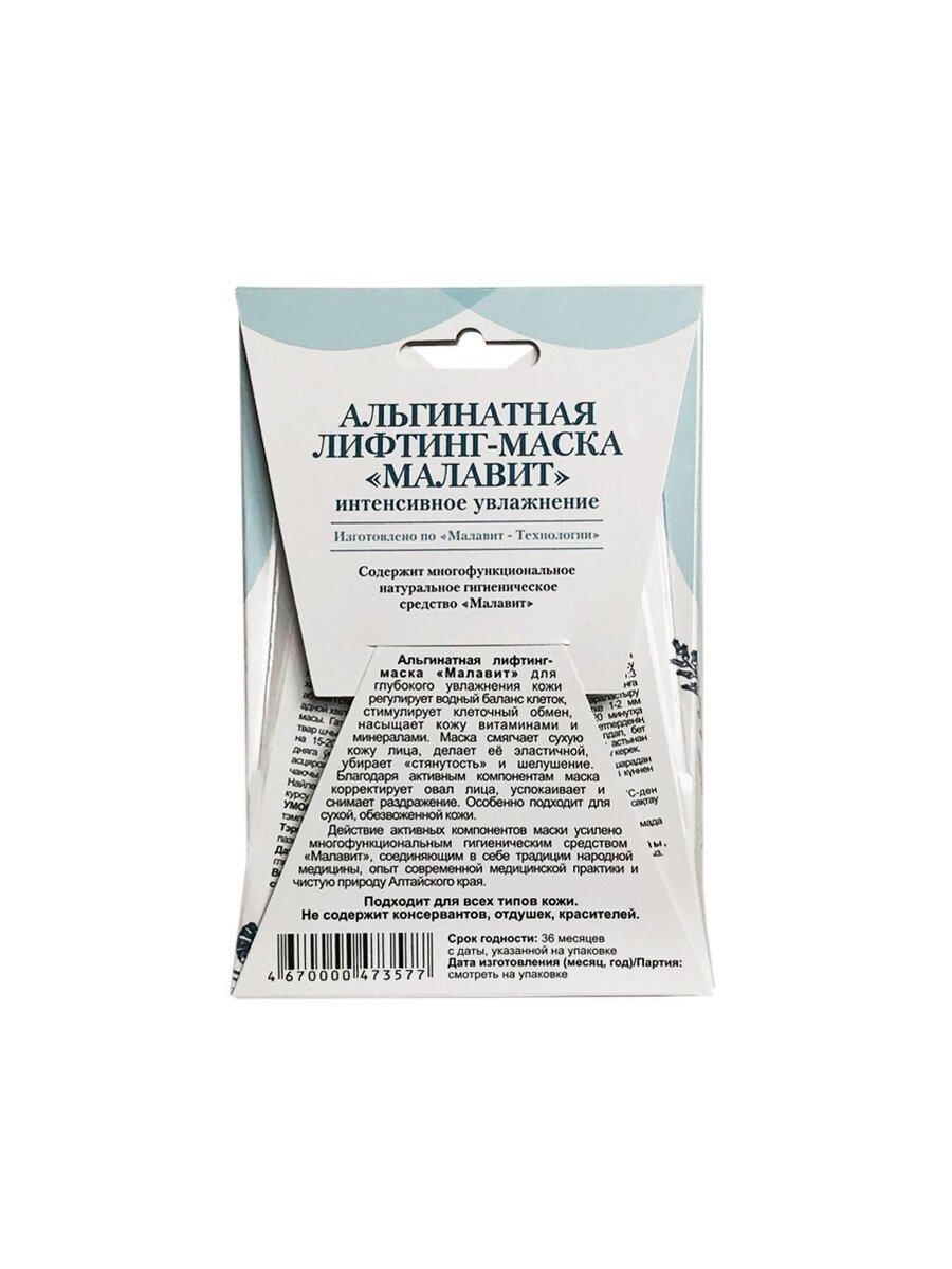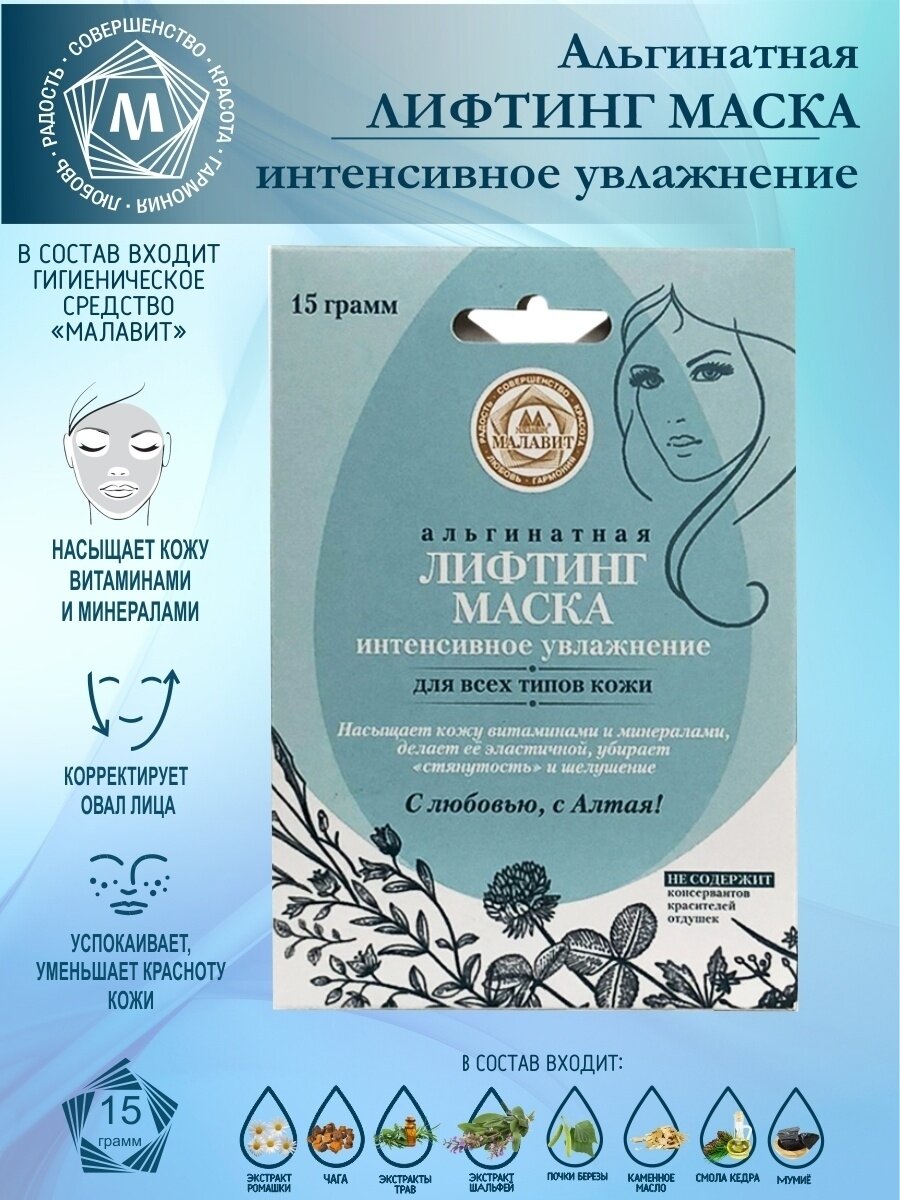 Альгинатная лифтинг-маска Малавит интенсивное увлажнение 15 гОписаниеАльгинатная Лифтинг-маска Малавит интенсивное увлажнениеИзготовлено по "Малавит-технологии"Содержит многофункциональное натуральное гигиеническое средство "Малавит"Альгинатная лифтинг-маска «Малавит» интенсивное увлажнение - для глубокого увлажнения кожи регулирует водный баланс клеток, стимулирует клеточный обмен, насыщает кожу витаминами и минералами. Маска смягчает сухую кожу лица, делает её эластичной, убирает «стянутость» и шелушение. Благодаря активным компонентам маска корректирует овал лица, успокаивает и снимает раздражение. Особенно подходит для сухой, обезвоженной кожи. Действие активных компонентов маски усилено многофункциональным гигиеническим средством «Малавит», соединяющим в себе традиции народной медицины, опыт современной медицинской практики и чистую природу Алтайского края.Подходит для всех типов кожи. Не содержит консервантов, отдушек, красителей.Способ применения: маска готовится непосредственно перед использованием. Небольшое количество (1/3 часть пакетика) сухого порошка отсыпать в емкость с холодной водой в соотношении 1:1 по объему и тщательно перемешать в течение одной минуты до получения однородной массы. Готовую маску сразу нанести на лицо плотным слоем 1-2 мм и оставить на 20-25 минут. Затем, предварительно увлажнив края маски водой, осторожно снять ее снизу вверх, отделяя от кожи лица.Наилучший результат достигается применением курса из 10–ти процедур через два дня.Ingredients/Состав: Diatomeaeearth/Диатомовая земля, Malavit/Малавит (вода очищенная ионизированная, глицерин, молочная кислота пищевая, медь углекислая основная, медь сернокислая, камедь, смола кедра, почки берёзы, почки сосны, кора дуба, мумиё, каменное масло, чага, экстракты: девясила, одуванчика, календулы, тысячелистника, мяты, чабреца, мать-и-мачехи, ромашки, аира, шалфея, бессмертника, эхинацеи, подорожника, чистотела), Alginate/Альгинат, Calciumsulphate/Сульфат кальция, Tetrasodiumpyrophosphate/Тетрасодиум пирофосфат, Sodiumhyaluronate/Гиалуронат натрия, Aminobutyric acid/Аминомасляная кислота.Малавит - многофункциональное натуральное средство для наружного и местного применения, продукт синтеза современных достижений традиционной, народной и интегративной медицины с дарами природы Алтая. Создан по оригинальной «Малавит-технологии», позволяющей значительно повысить защитные силы организма. Обладает антибактериальным действием.Альгинаты (соли альгиновой кислоты) - содержатся в бурых морских водорослях. Альгинаты, смешиваясь с водой, образуют гель, в котором содержится множество минеральных веществ, витаминов и белков. Благодаря их содержанию маска обладает выраженным эффектом лифтинга, увлажняет, укрепляет и питает кожу, стимулирует обменные процессы, увеличивает поступление кислорода в кожу, обладает противовоспалительным и антибактериальным действием. Диатомовая земля образуется из диатомового ила.