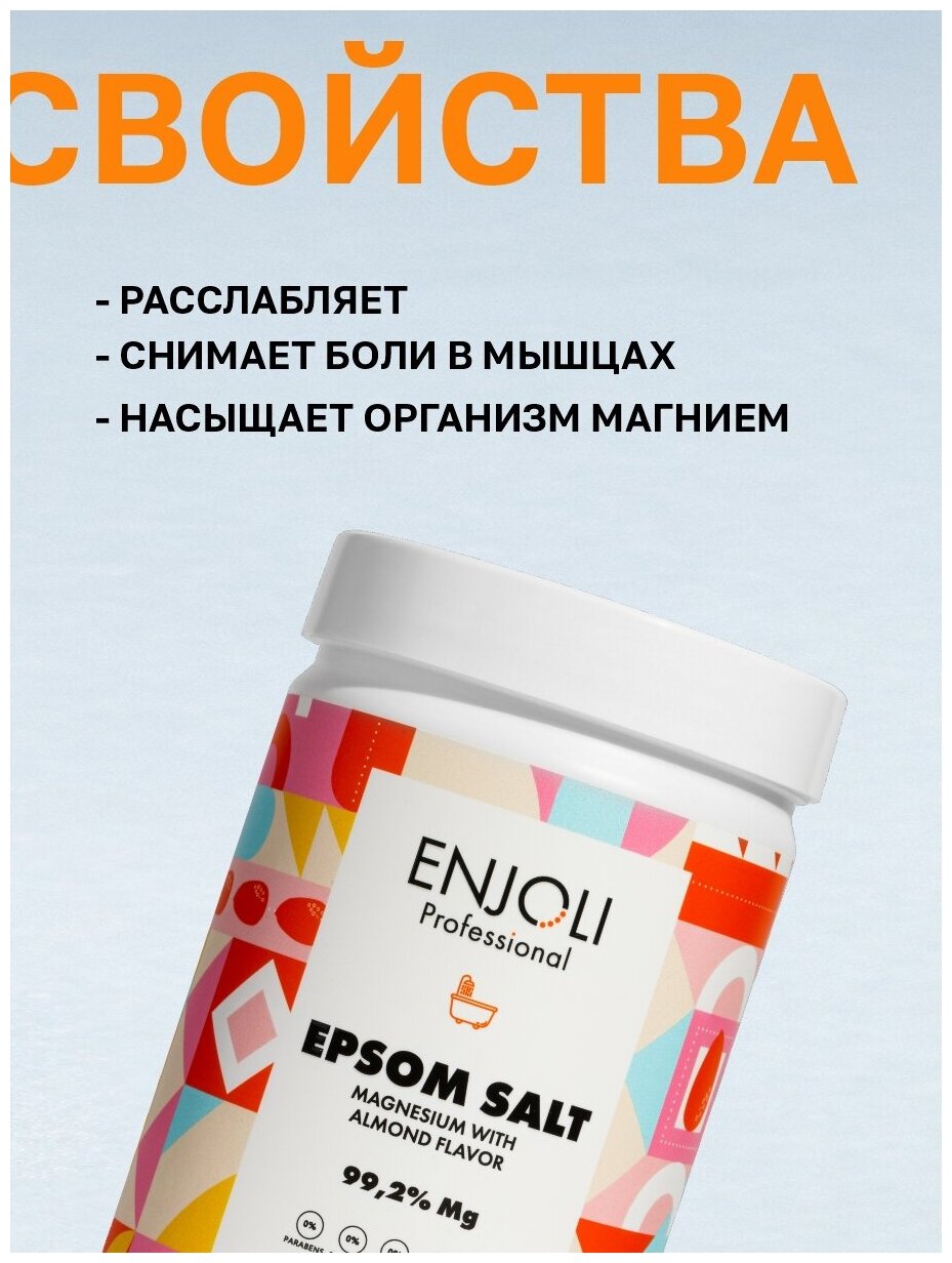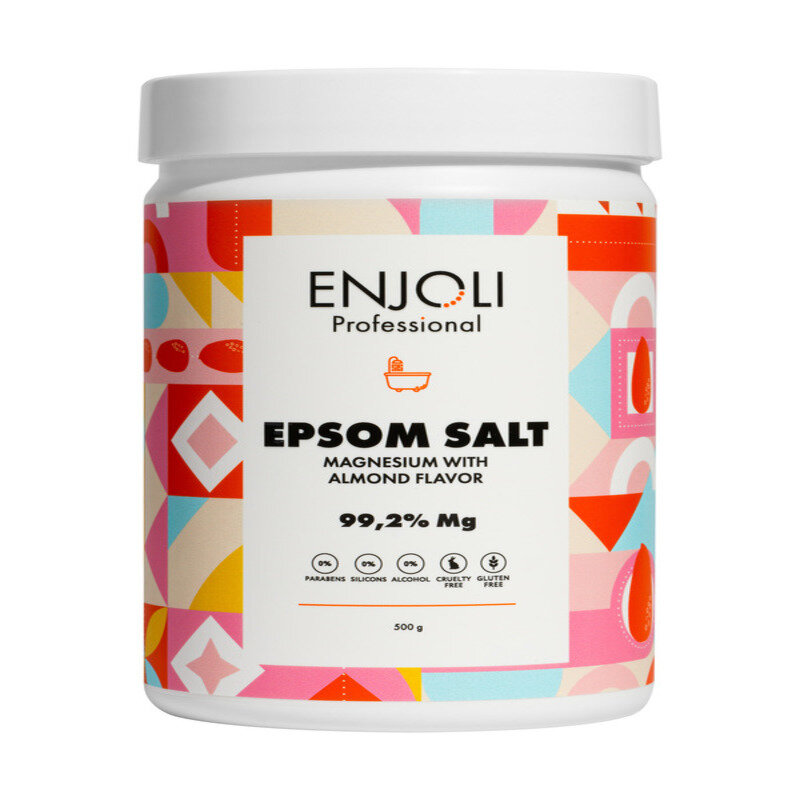 Соль для ванны Enjoli является натуральным источником магния 99,9%.Английская магниевая соль epsom расслабляет и снимает боли в мышцах,помогает в борьбе от целлюлита,при детокс процедурах,насыщает организм магнием,помогает от отёков.Магнезия способствует выведению токсинов из организма,что благотворно влияет на коррекцию фигуры.При приеме ванн отлично подходит для похудения,расслабления,борется со стрессом,следами усталости,выводит лишнюю воду из организма,снимает воспаления на коже,восполняет дефицит магния в организме. Соль эпсом обеспечивает комплексный уход за кожей,ногами и руками,волосами,а также за ногтями.Средство можно использовать как скраб для кожи,ванну для ног,маску для ногтей и даже обертывание.Частички соли мягко отшелушивают кожу снаружи,а магний очищает организм изнутри.Чтобы увидеть результат, рекомендуем проводить процедуры необходимо 2-3 раза в неделю,курсом 10-15 процедур.