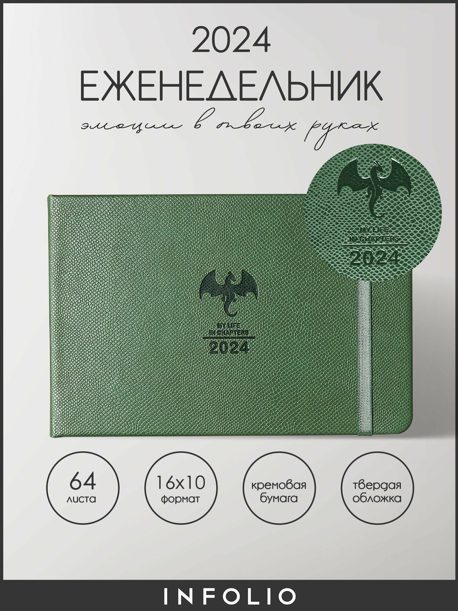 Еженедельник датированный на 2024 год Dragon зеленый 64 листа InFolio