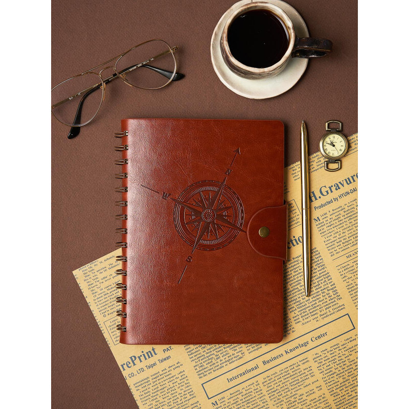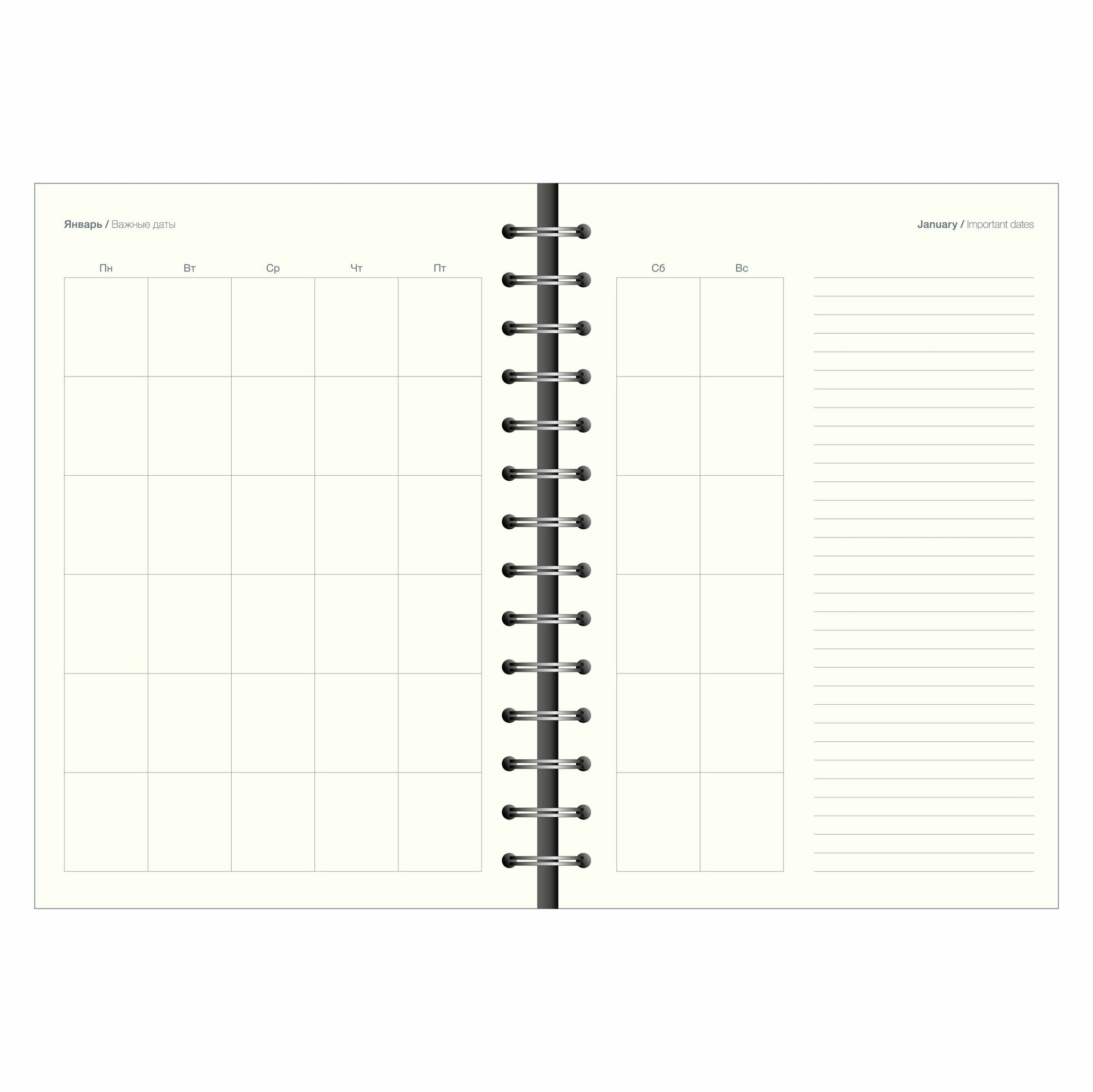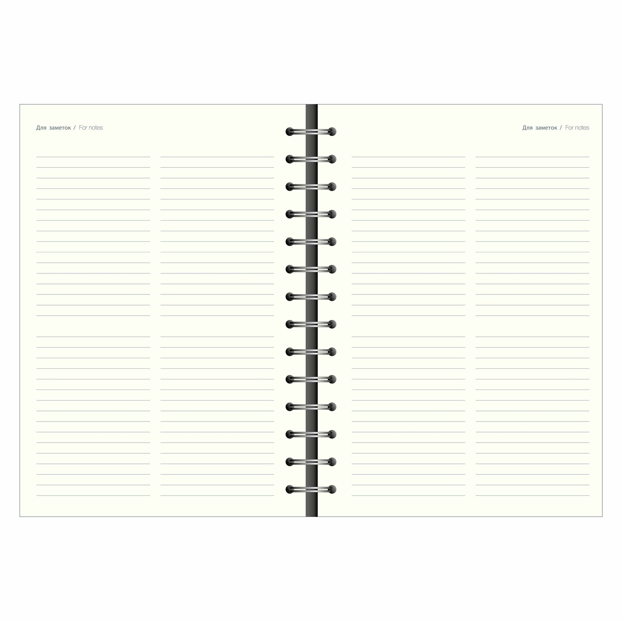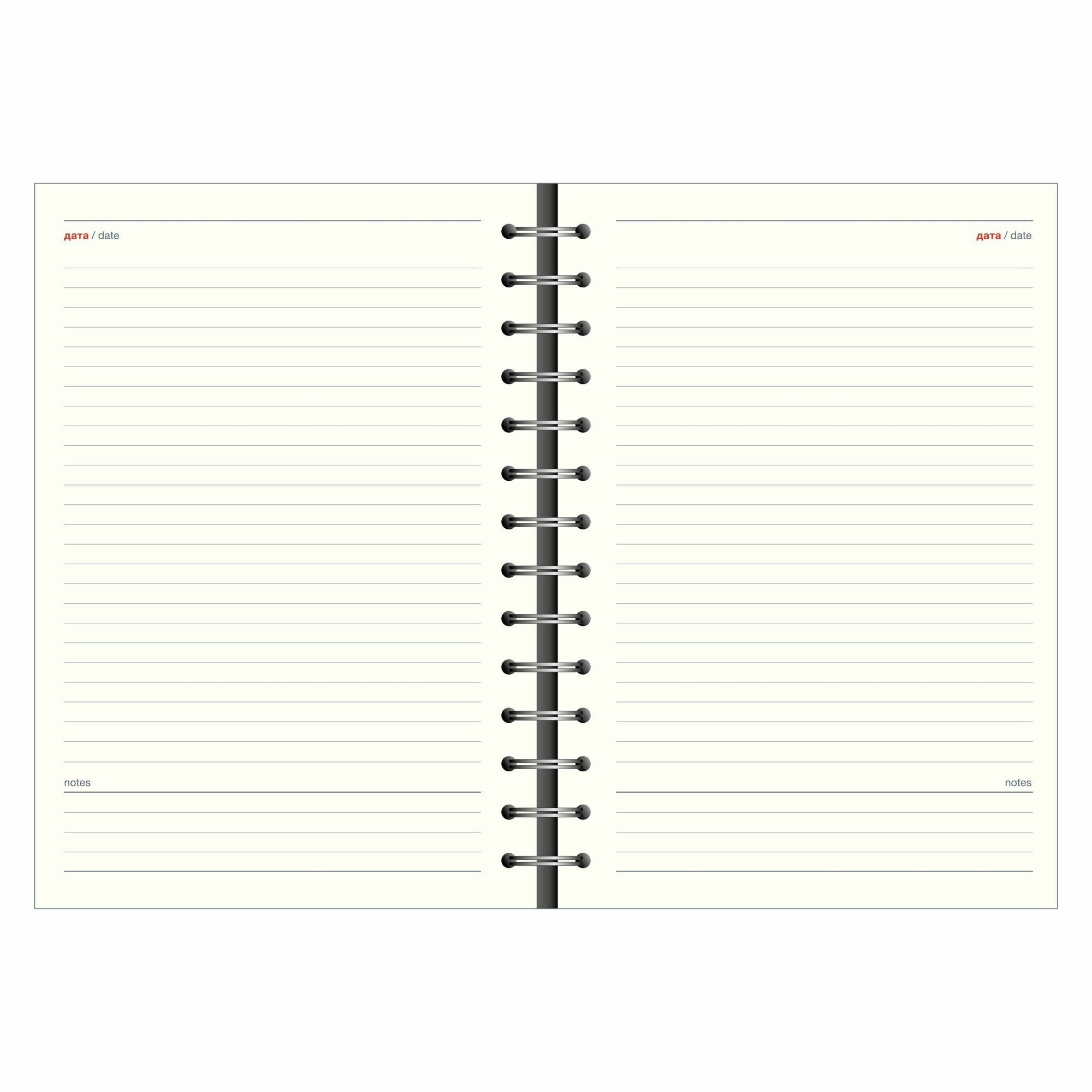 Обложка - мягкая, полускрытая спираль, фактурная полуглянцевая искусственная кожа, цвет - коричневый. Блок - недатированный, 192 стр., скругленные уголки, бумага: слоновая кость, прямые уголки, 70 г/м2, печать 2+2. Особенности: блок на спирали, блинтовое тиснение.