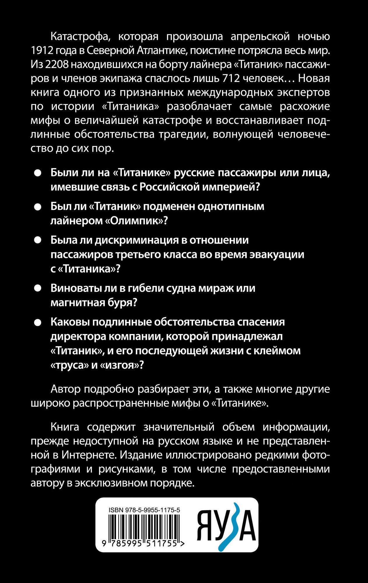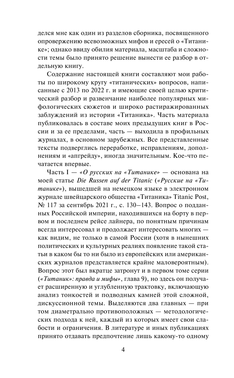 Новая книга одного из признанных международных экспертов по истории «Титаника», разоблачает самые расхожие мифы о величайшей катастрофе и восстанавливает подлинные обстоятельства трагедии, волнующей человечество до сих пор. Книга содержит значительный объем информации, прежде недоступной на русском языке и не представленной в Интернете. Издание иллюстрировано редкими фотографиями и рисунками, в том числе предоставленными автору в эксклюзивном порядке.
