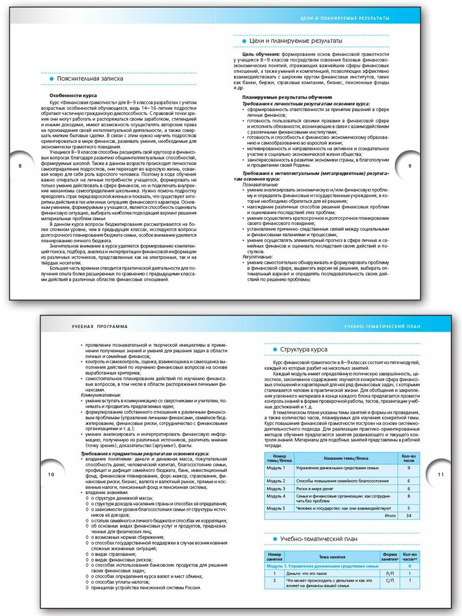 Пособие содержит учебную программу курса «Финансовая грамотность» для 8-9 классов и методические рекомендации для учителя. В программе указаны цели и задачи курса, основные планируемые результаты и система их оценивания, предложены формы и методы организации образовательного процесса. В методических рекомендациях пошагово описана организация учебной деятельности для достижения поставленных целей, подобран дополнительный материал для учителя, предлагаются темы для дискуссий.