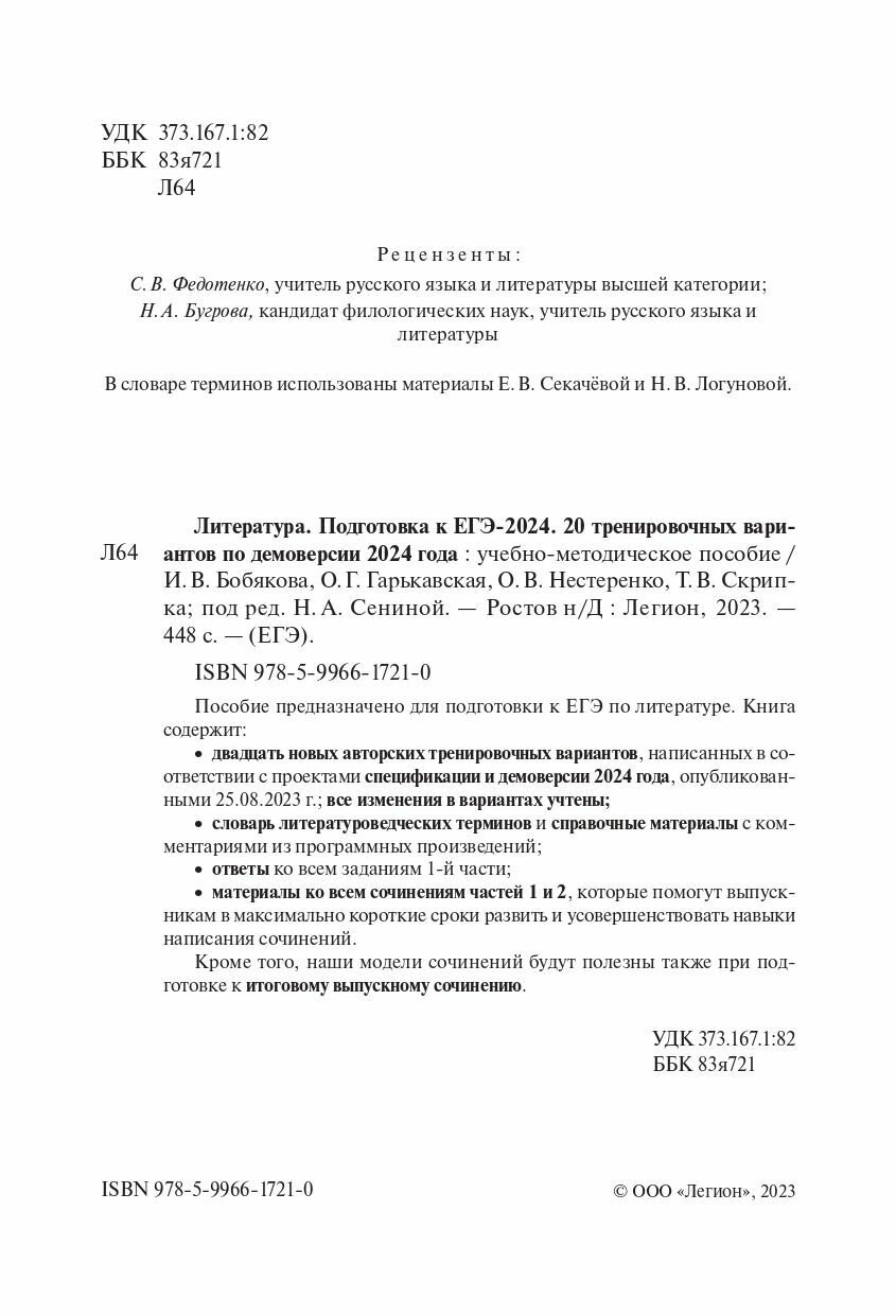 Литература. Подготовка к ЕГЭ-2024. 20 тренировочных вариантов по демоверсии 2024 года (Бобякова Ирина Валерьевна, Нестеренко Ольга Владимировна, Скрипка Татьяна Владимировна); Легион, 2023