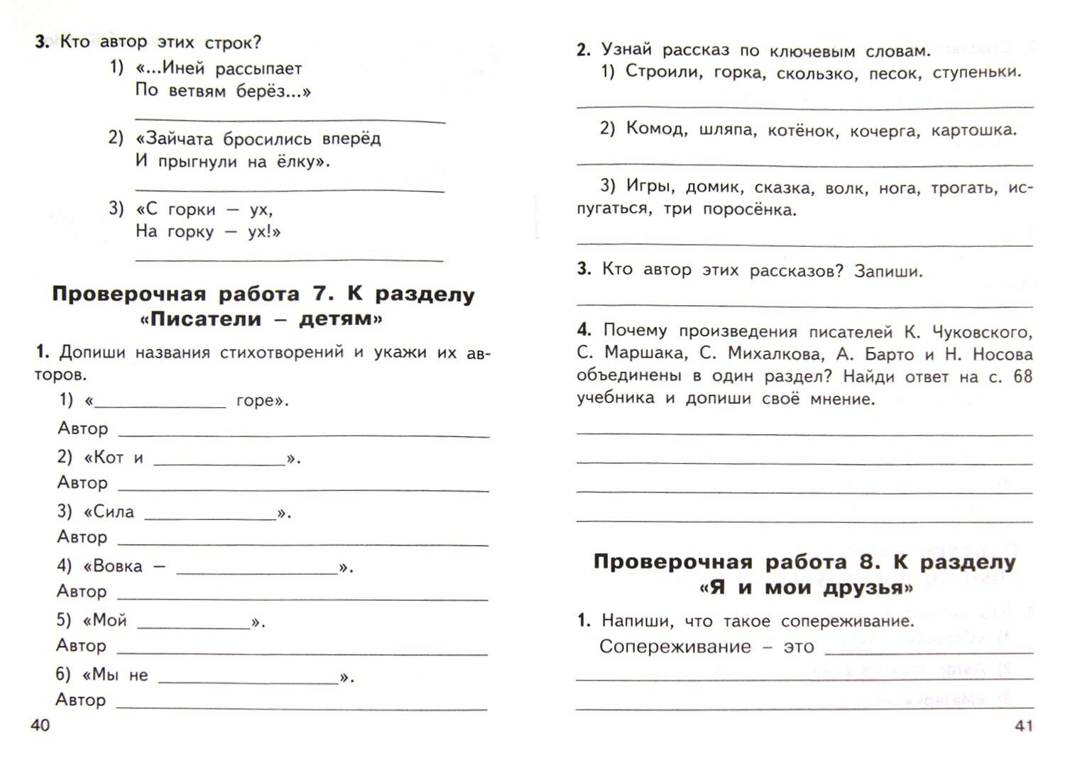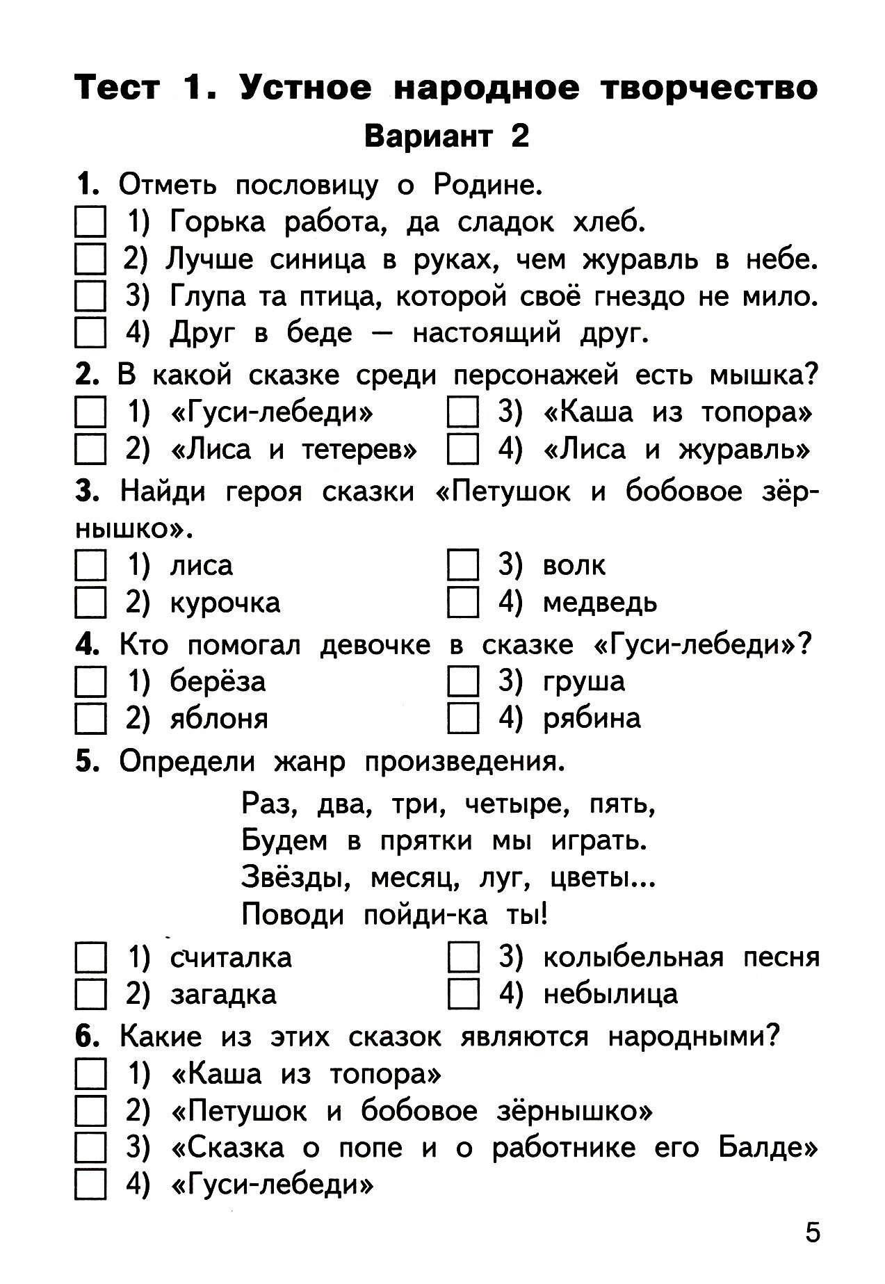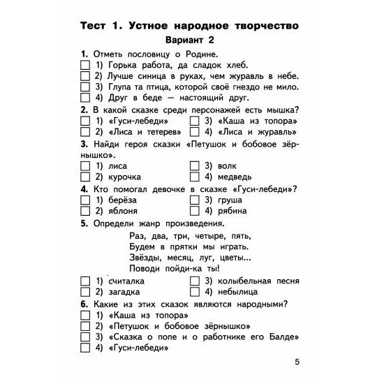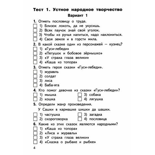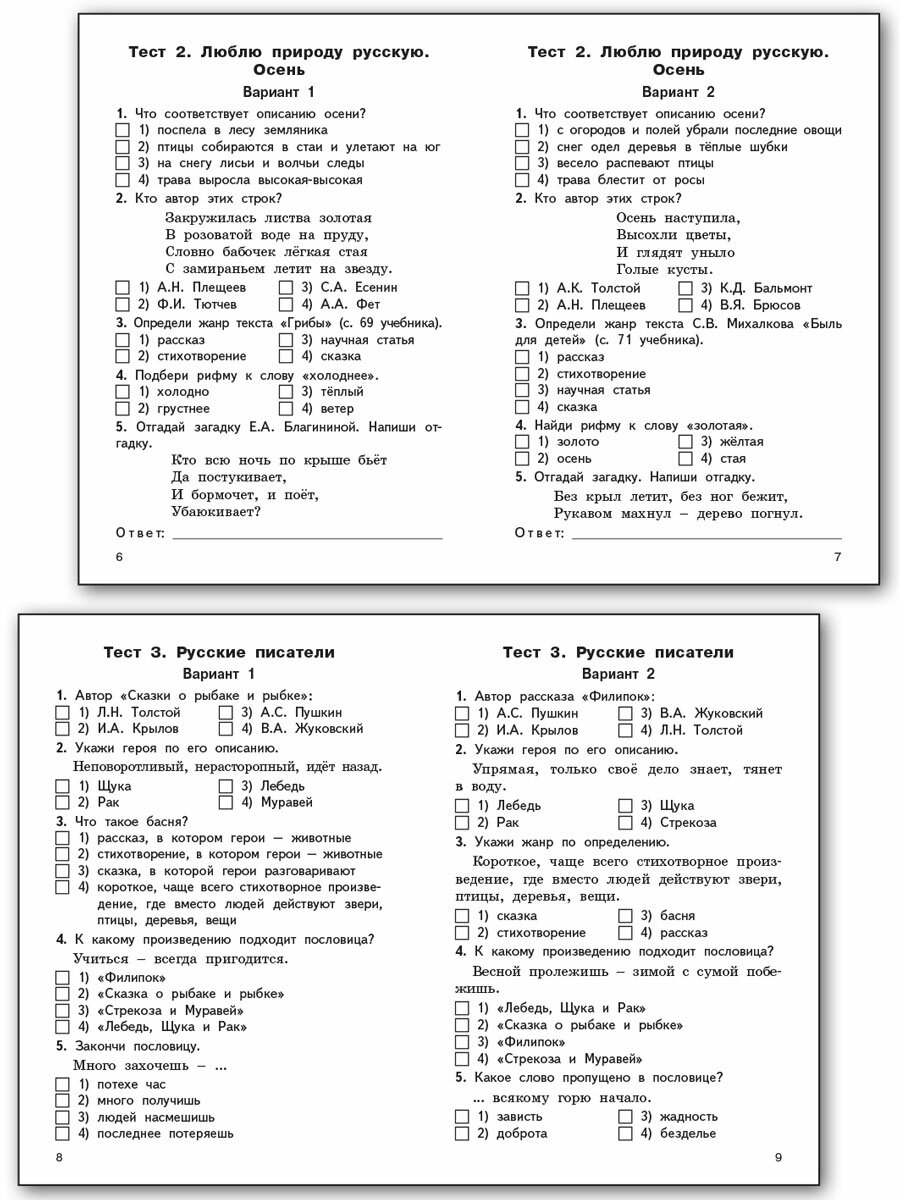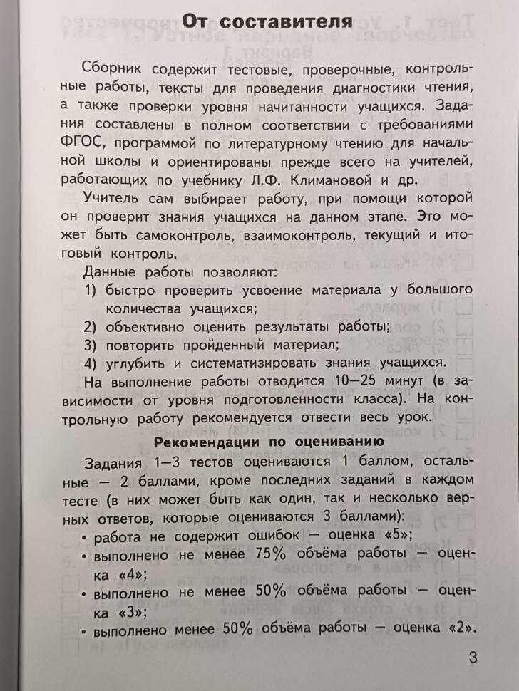Сборник содержит тестовые, проверочные и контрольные работы, которые помогут педагогу организовать контроль умений, навыков и знаний учащихся. Приведены также тексты для проведения диагностики усвоения прочитанного, включены вопросы, проверяющие уровень начитанности школьников. Все задания соответствуют программе общеобразовательных организаций и требованиям ФГОС-2021 для начальной школы.