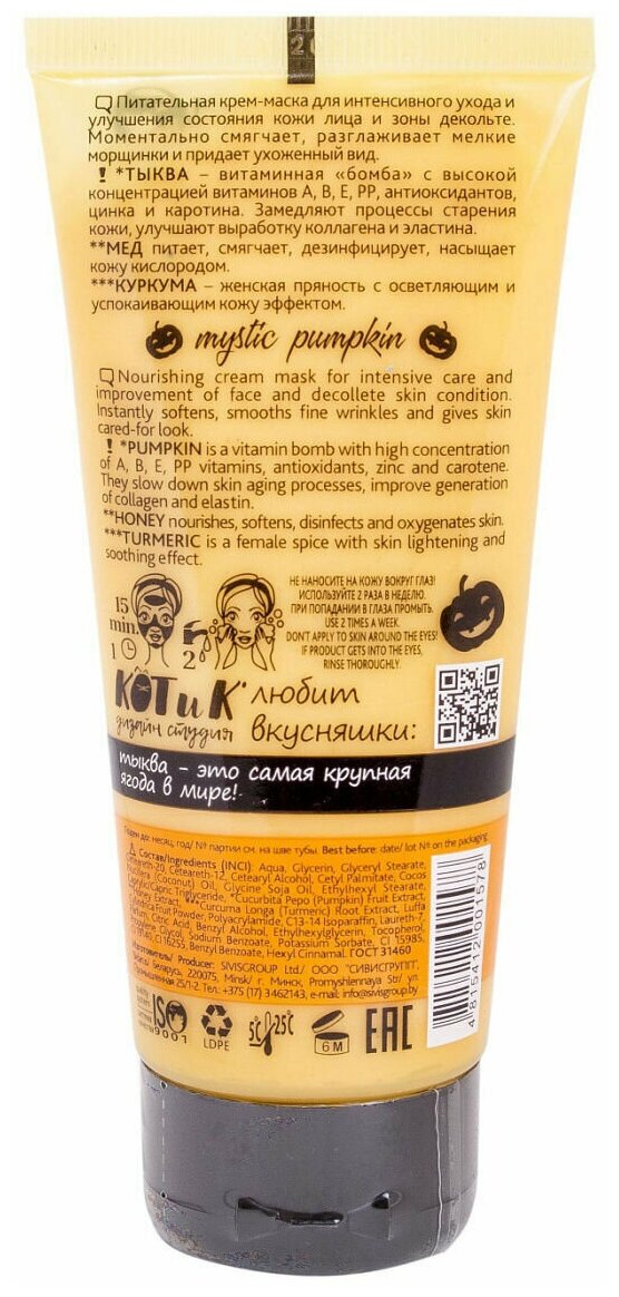 Питательная крем-маска улучшает состояние кожи лица и зоны декольте. Она моментально смягчает и разглаживает мелкие морщинки и придает коже ухоженный и здоровый вид. Экстракт тыквы улучшает цвет кожи, защищает от повреждений и способствует регенерации поврежденных клеток. Эффективно борется с акне, шелушением и зудом. Экстракт меда увлажняет кожу, помогает бороться с акне, уменьшат воспаление и раздражение, предотвращает преждевременное старение кожи лица. Экстракт куркумы оказывает смягчающее действие, наполняет кожу дополнительной влагой, ускоряет процесс заживления и защищает кожу от ультрафиолета и других агрессивных факторов окружающей среды.