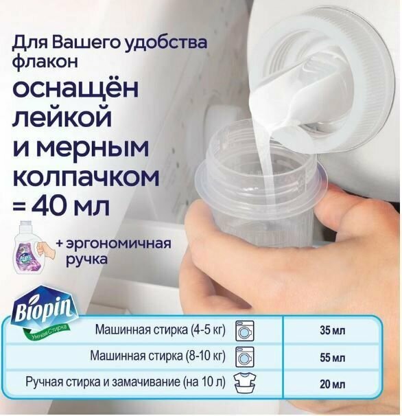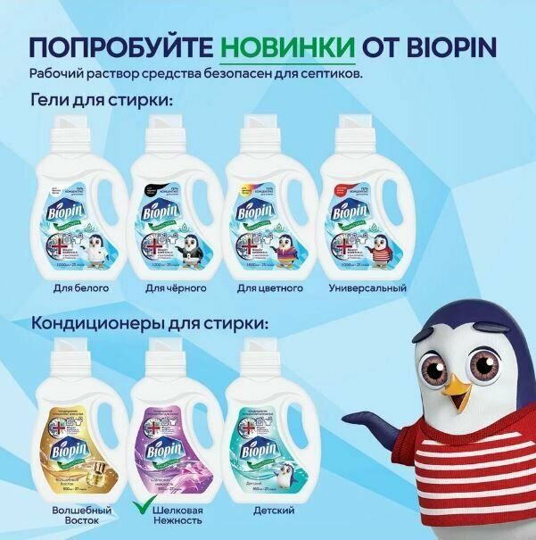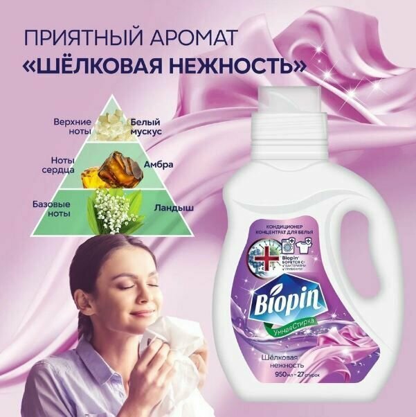 Композиция "ШЕЛКОВАЯ НЕЖНОСТЬ" открывается изысканной мелодией белого мускуса, в сердце — соло благородной амбры, а база преподносит богатую палитру оттенков свежего благоухания нежного ландыша. Концентрированный кондиционер для стирки концентрированный BIOPIN экономичен в использовании. Средство прекрасно выполаскивается. Не оставляет разводов. BIOPIN ополаскиватель для белья безопасен для септических установок.