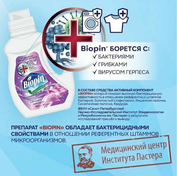 Кондиционер для белья концентрированный BIOPIN содержит антибактериальный компонент "BIOPIN", который активно борется с широким спектром грибков и бактерий. Предназначен для использования в стиральных машинах любого типа, а также для ручной стирки. Кондиционер деликатно воздействует на белье, придаёт мягкость и способствует быстрому высыханию после стирки. Кондиционер обладает антистатическим эффектом, обеспечивает легкую глажку одежды, придавая ей приятный аромат.