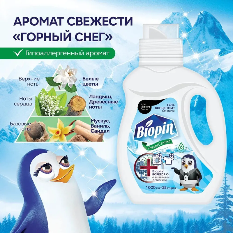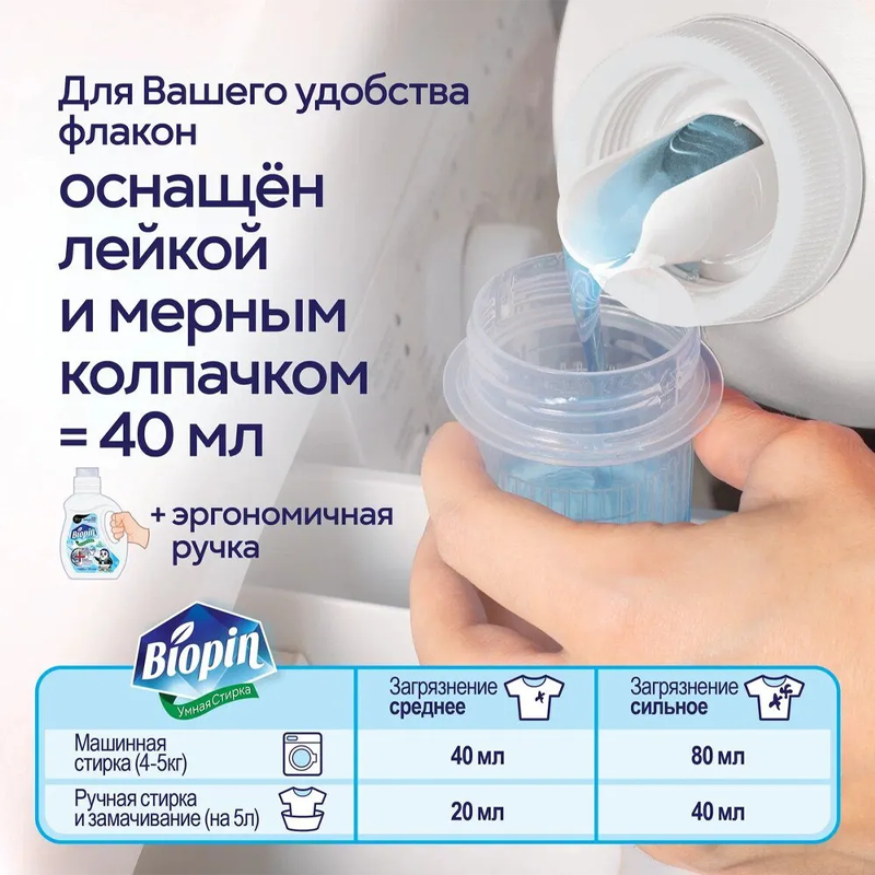 Гель для стирки концентрированный BIOPIN содержит антибактериальный компонент "BIOPIN", который активно борется с широким спектром грибков и бактерий. Эффективная формула сбалансированных ПАВ и специально подобранный комплекс энзимов бережно отстирывают изделия из хлопка, синтетики и смесовых тканей в стиральных машинах любого типа и при ручной стирке. Специальный компонент в составе помогает сохранить яркие цвета вещей и препятствует окрашиванию светлых тканей в случае совместной стирки с цветными. Средство деликатно воздействует на одежду, придавая ей приятную свежесть. Уникальный аромат открывается нотами нежного букета первых весенних цветов на базе из белого мускуса и сандала. Гель для стирки концентрированный BIOPIN экономичен в использовании. Средство прекрасно выполаскивается. Не оставляет разводов. BIOPIN гель для стирки концентрированный безопасен для септических установок.