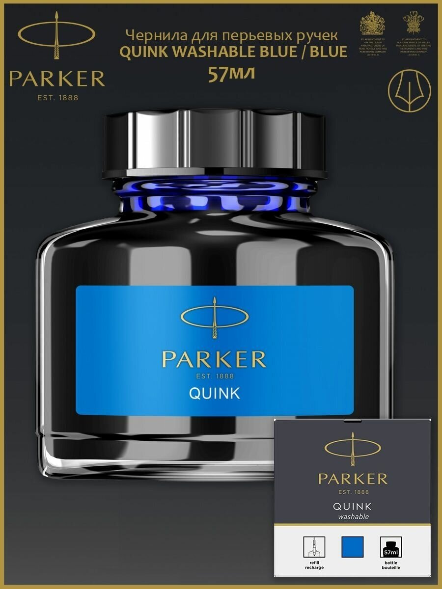 Цвет чернил : синие смываемые. Количество в упаковке: 1 шт. Объем: 57 мл. Срок годности : сохраняют свежесть 10 лет при правильном хранении. Назначение: рекомендованы для всех моделей перьевых ручек Parker имеющих конвертор для заправки. Упаковка : картонная коробочка. Размер упаковки : 44 х 66 х 69 мм. Вес : 177 гр. Страна производитель : Франция. Чернила и стрежни Parker Quink разработаны таким образом, чтобы обеспечить наилучшую производительность. Специально созданные для использования с ручками Parker , они предлагают оптимальное качество письма без перерывов и клякс - только совершенные чистые штрихи. Поэтому компания Parker рекомендует использовать только оригинальные чернила, стержни и картриджи Quink . Впервые чернила Quink поступили в продажу в 1931 году. Это название представляет собой смесь из слов "quick" и "ink" ("быстрый" и "чернила"). Оно призвано отражать качество расходных материалов Parker : чернила Quink быстро высыхают, когда попадают на бумагу, но не тогда, когда они еще находятся на пере вашей авторучки Parker .