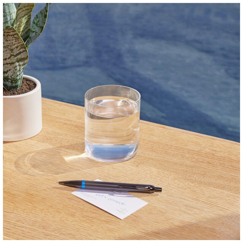 Подарочная шариковая ручка Parker из коллекции IM выполнена из нержавеющей стали и покрыта матовым лаком металлик чёрного цвета. Декоративные элементы c отделкой PVD. Дополнена акцентными кольцами насыщенного голубого цвета. Изделие отлично подойдёт в качестве подарка как для коллеги, так и для руководителя. Ручку удобно закреплять на ежедневнике, планшете или кармане благодаря прочному клипу из нержавеющей стали. Диаметр пишущего узла составляет 1,0 мм, толщина линии – 0,8 мм. Ручка упакована в оригинальную картонную подарочную коробку Parker. Ручка поставляется в комплекте с шариковым стержнем синего цвета. • цвет чернил: синий; • толщина линии письма: 0,8 мм; • диаметр пишущего узла: 1,0 мм; • цвет корпуса: чёрный; • тип упаковки: подарочная коробка Parker; • комплектация: футляр, ручка, стержень синего цвета.
