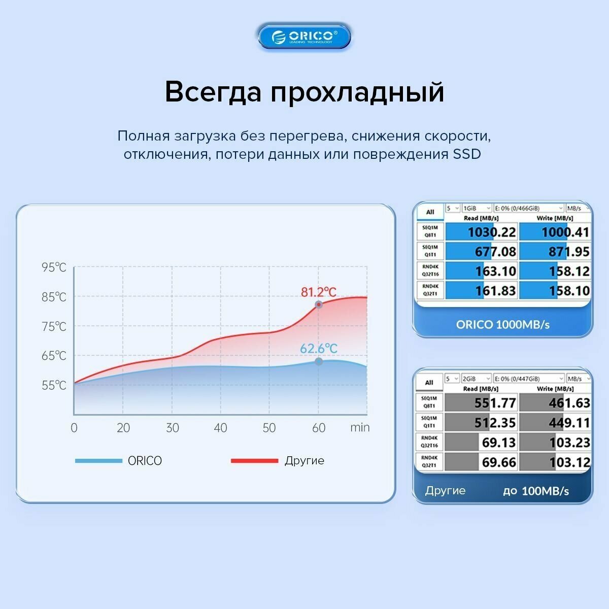 Корпус ORICO с двумя отсеками M.2 NVME + NVME SSD. Корпус сделан из алюминиевого сплава, что отлично способствует охлаждению. Скорость передачи данных до 10Гбит/с, по кабелю Type-C к Type-C/USB-A длинной 30см. Максимальный объем накопителя до 4ТБ.