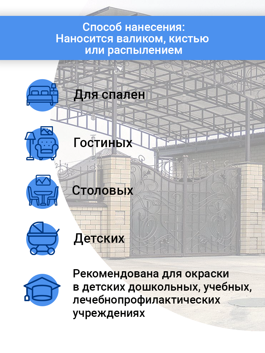 - Предназначена для окраски стен и потолков в сухих и влажных помещениях (кухни, ванные), в помещениях с повышенной проходимостью, в детских и медицинских учреждениях.