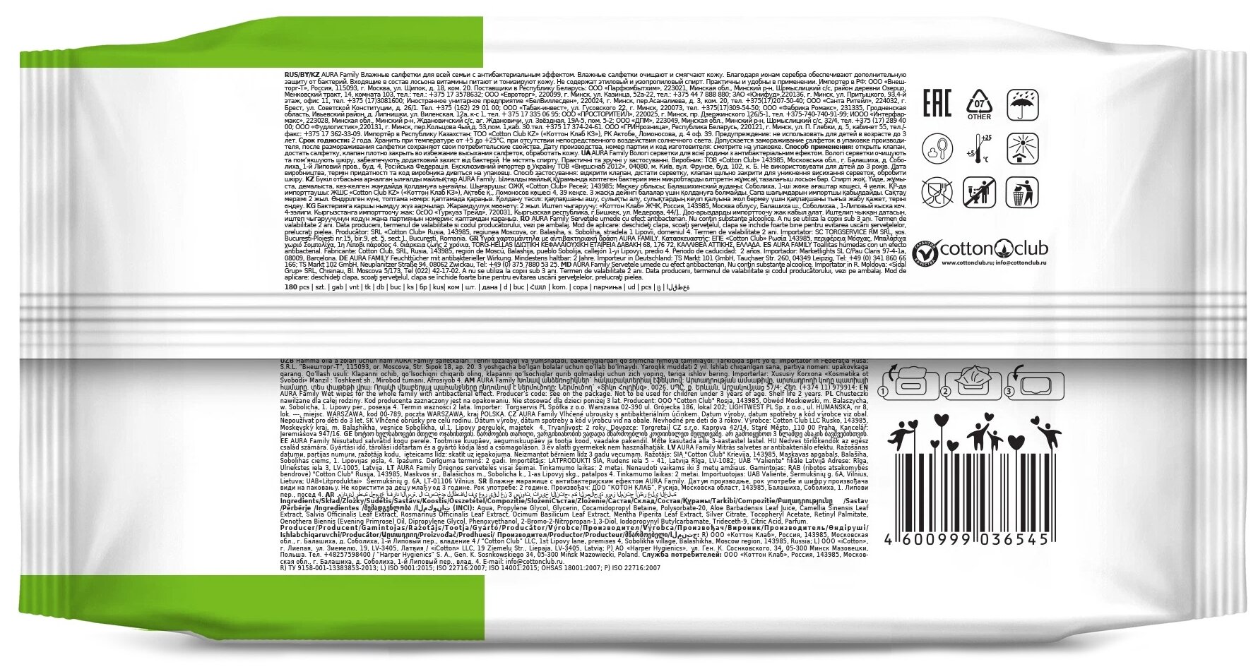 Влажные салфетки с антибактериальным эффектом Aura Family big-pack с крышкой 180 шт