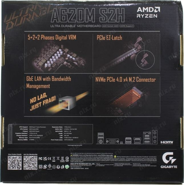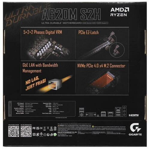 Материнская плата GIGABYTE A620M S2H обладает мощными техническими характеристиками, поддержкой фирменных технологий и качественной элементной базой Ultra Durable. Она выполнена в компактном форм-факторе Micro-ATX и содержит в своей основе чипсет AMD A620. На плате расположены 2 слота под модули оперативной памяти объемом не более 96 Гб, 1 слот расширения PCI-E x16 и 1 слот PCI-E x1 для создания графической системы, 4 разъема SATA 6Gb/s и 1 разъем M.2 для накопителей HDD/SSD. За организацию проводной сети Интернет отвечает контроллер Realtek (1000 Мбит/с). Востребованные порты и разъемы предусматривают подключение различного оборудования. Плата GIGABYTE A620M S2H оборудована разъемом для светодиодной ленты и характеризуется поддержкой подсветки RGB FUSION с возможностью гибкой настройки в фирменном приложении по собственным предпочтениям.