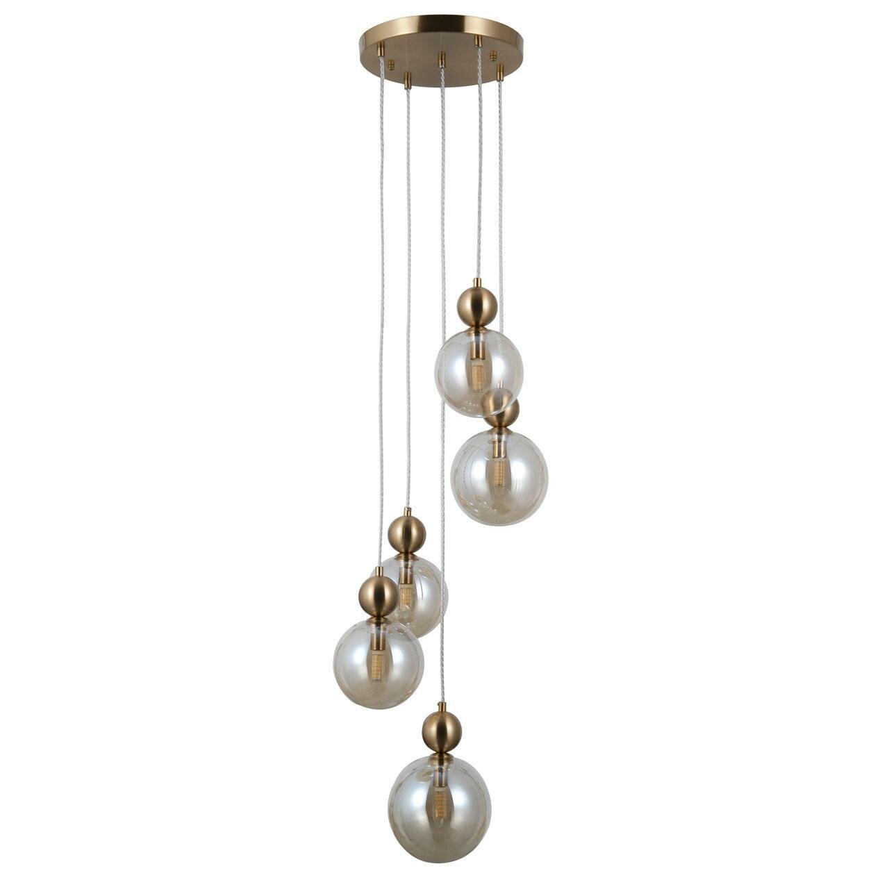 Металлическое основание подвесной люстры гальванизировано в цвет медовой бронзы. Источники света закрыты стеклянными плафонами, гальванизированными в цвет топаза.
