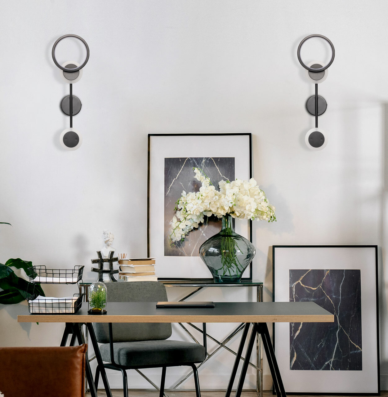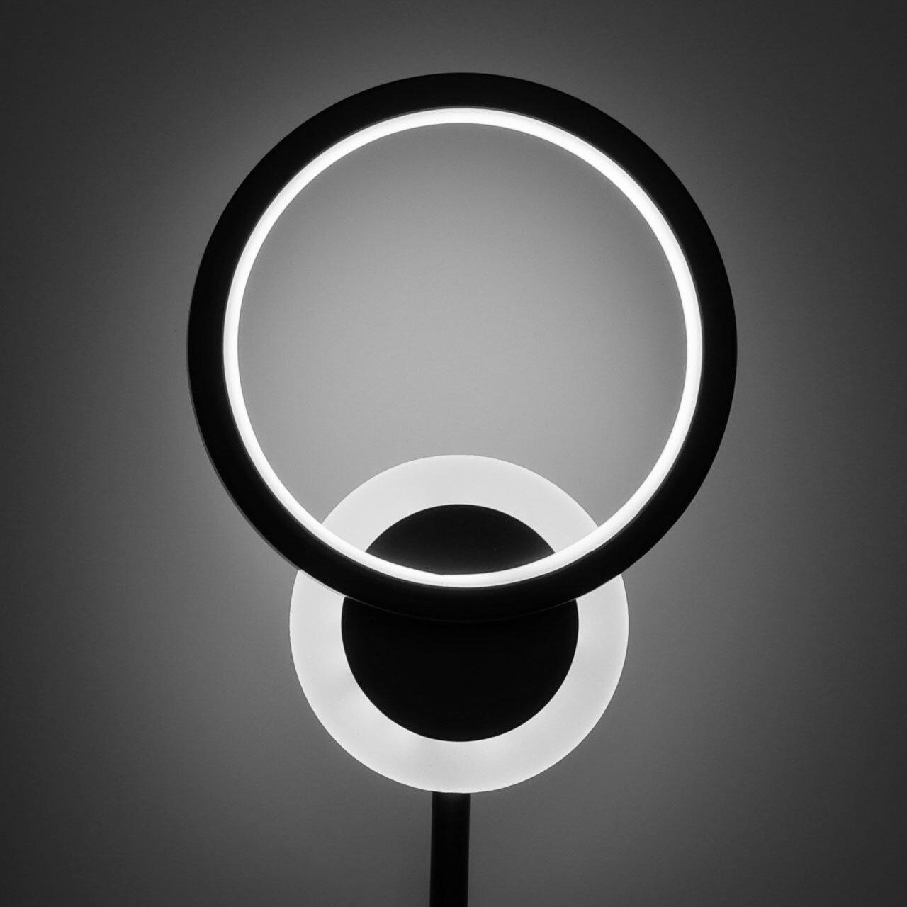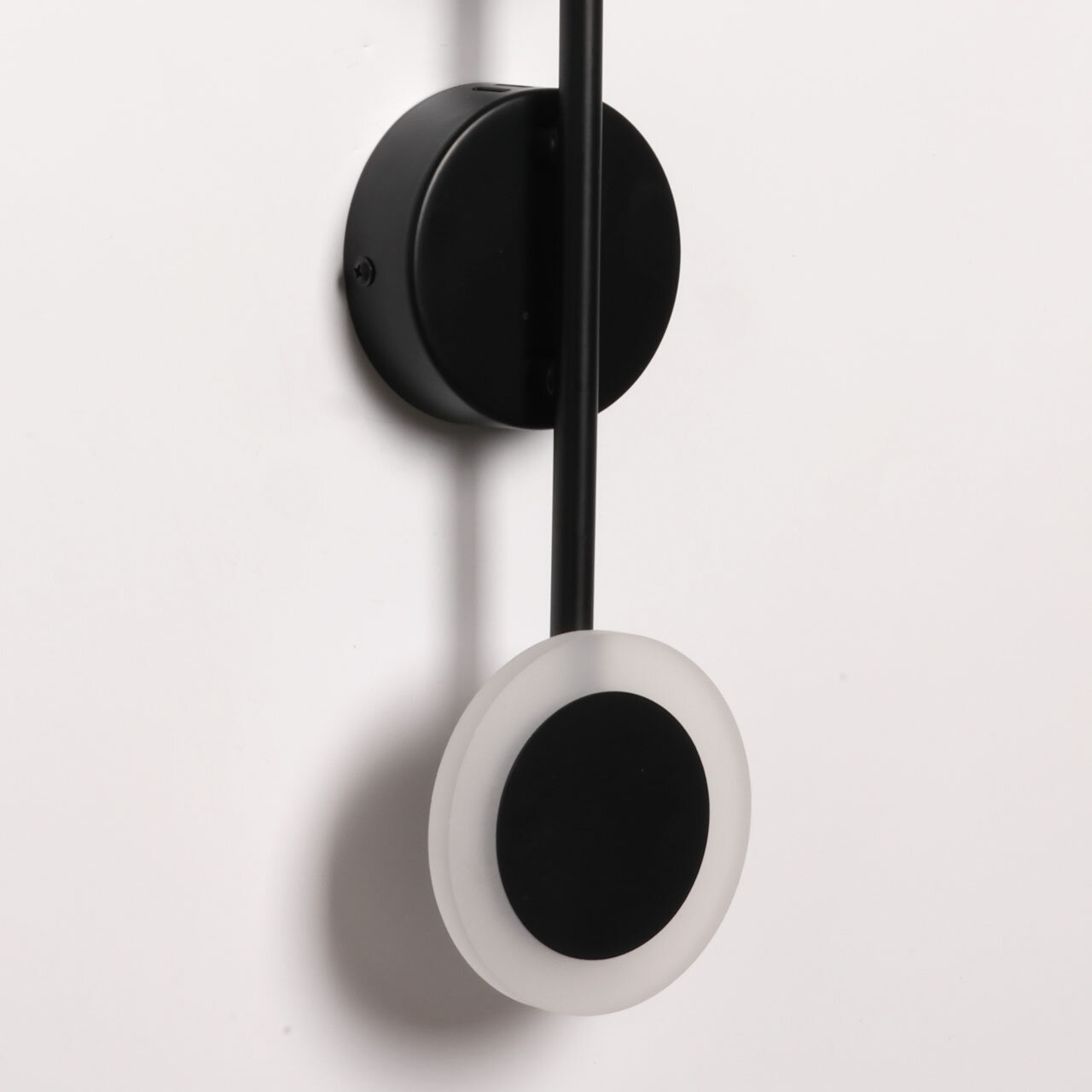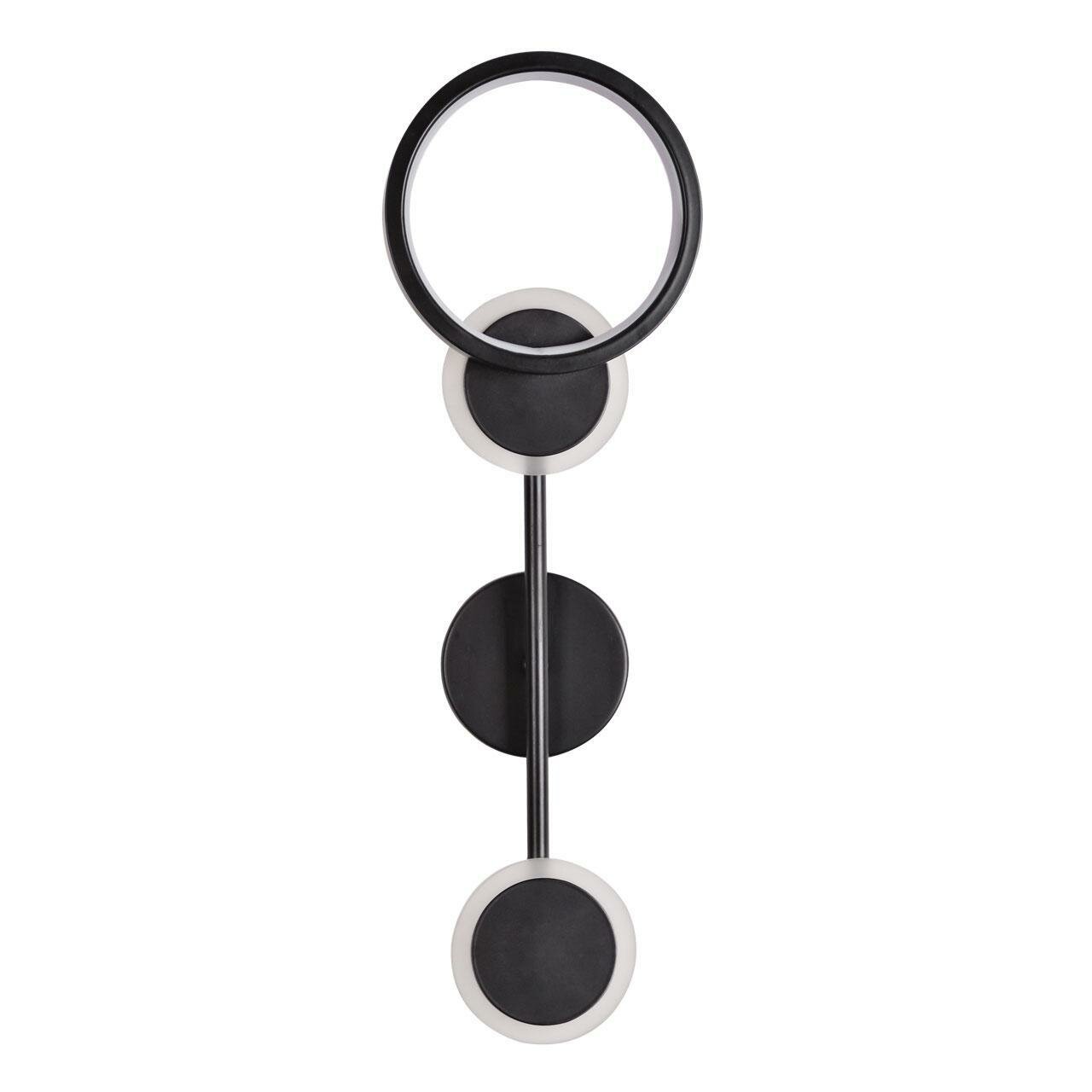 Минималистичный дизайн и строгая геометрия выполнены в немецких традициях стиля баухаус. Оригинальный современный дизайн настенного бра востребован. Черный цвет основания бра создает эффектный акцент в интерьере. Светодиодные источники света экономичны и безопасны. Металлическое основание настенного бра окрашено в черный цвет. Корпус плафона выполнен из сплава алюминия с цинком и окрашен в цвет основания. Светодиодные источники света закрыты матовым акрилом.