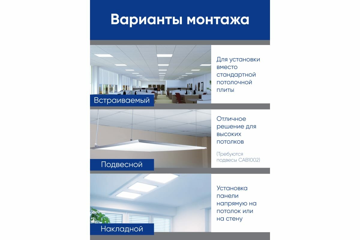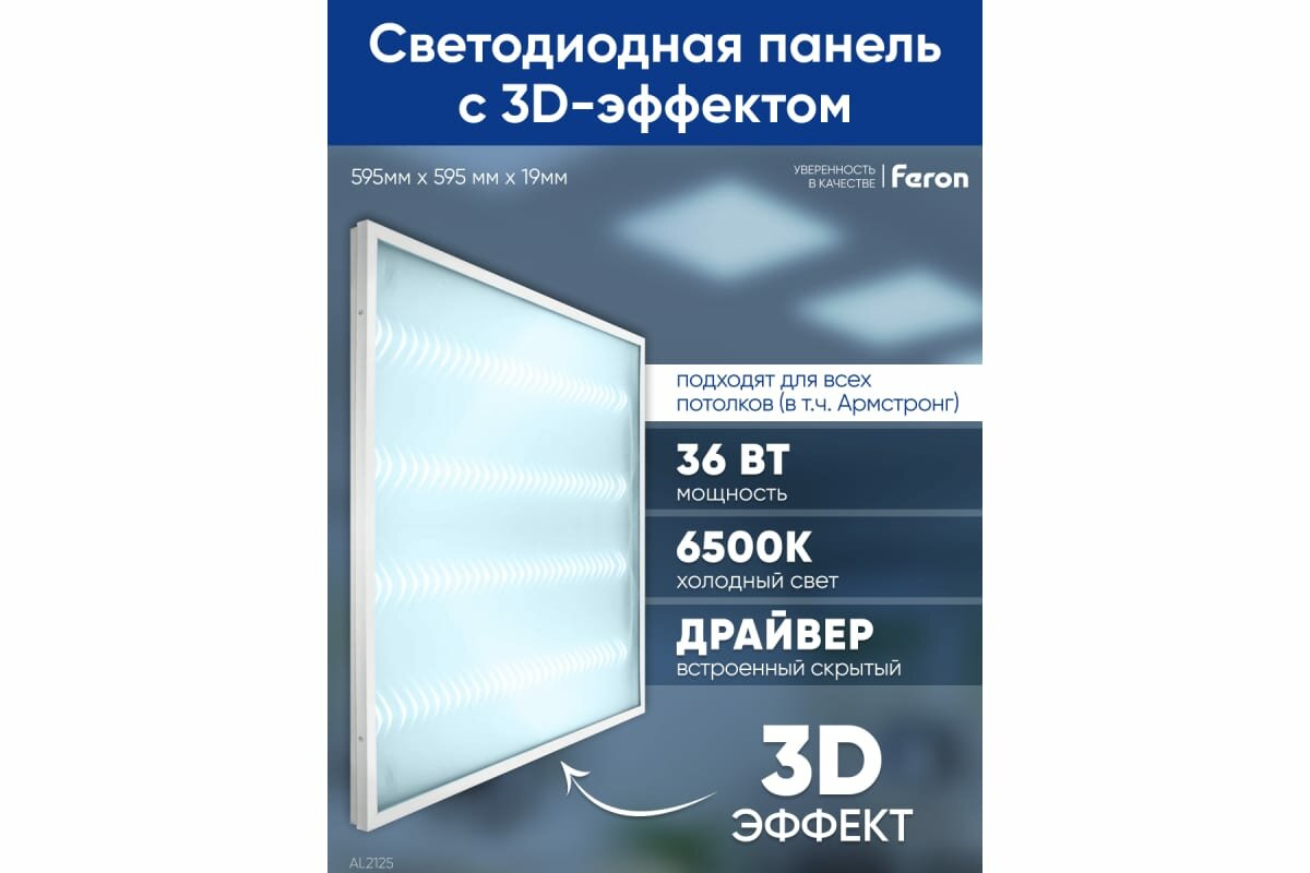 Способ монтажа: встраиваемый накладной и подвесной. Для подвеса панели можно использовать два комплекта CAB1002.. Светильник встраиваемый светодиодный, АРМСТРОНГ (ДВО) FERON AL2125, 36W 6500К (дневной), 185-265V, 3100Lm, IP40, угол рассеивания 120°, цвет белый, корпус штампованная сталь, рассеиватель пластик с 3D эффектом, 595*595*19 мм, монтажн.отв. 595*595 мм.