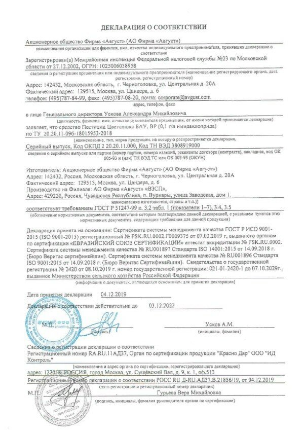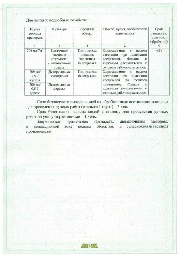 | Применение продукта | Полностью готовый к применению системный инсектицид для уничтожения тли, трипсов, белокрылки на цветочно-декоративных культурах. |