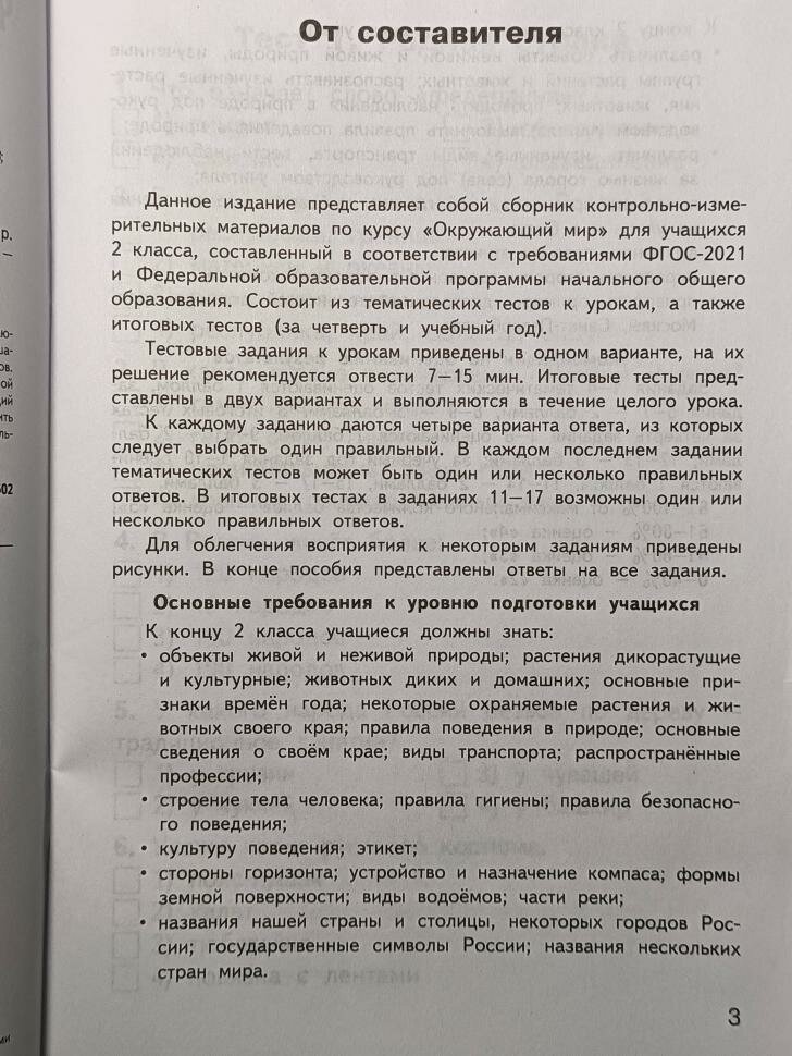 В пособии представлены контрольно-измерительные материалы по курсу «Окружающий мир» для 2 класса к учебнику А.А. Плешакова (М.: Просвещение). Все задания соответствуют программе общеобразовательных учреждений и требованиям ФГОС для начальной школы. Систематическая работа с материалами сборника позволит обучить школьников работе с тестами, что поможет в дальнейшем успешно выполнить задания государственной аттестации. Издание адресовано учителям начальных классов, а также школьникам и их родителям.