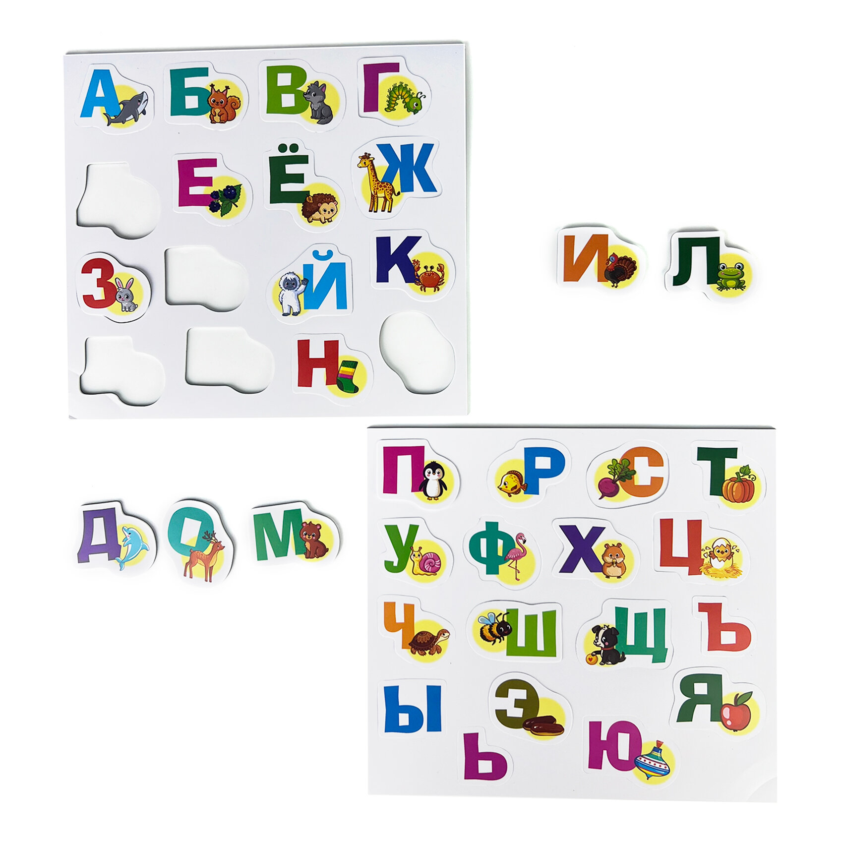 Игра знакомит с буквами русского алфавита, учит определять первый звук в слове и сопоставлять его с буквой, активизирует речь.