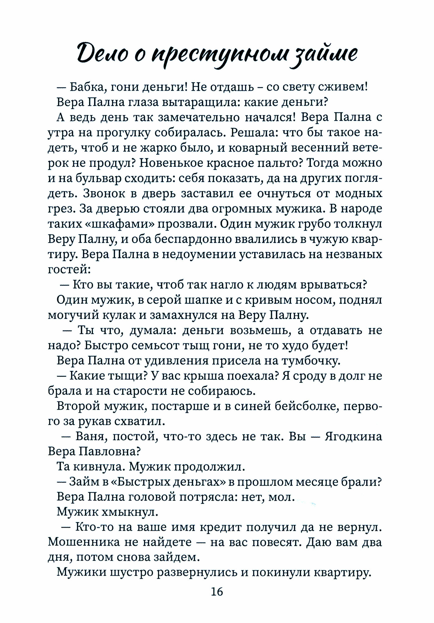 Живет и – не скучает. Будни Веры Павловны наполнены загадочными происшествиями и таинственными событиями. Умная и находчивая Вера Пална с азартом разгадывает загадки и ищет виновных. Кражи, драки, черные лесорубы и даже убийства! Вера Пална всегда в центре событий. А помогает ей лучшая подруга и бывшая прима местного театра экстравагантная Зоя Семеновна, а также хитрый и пронырливый кот Васька.