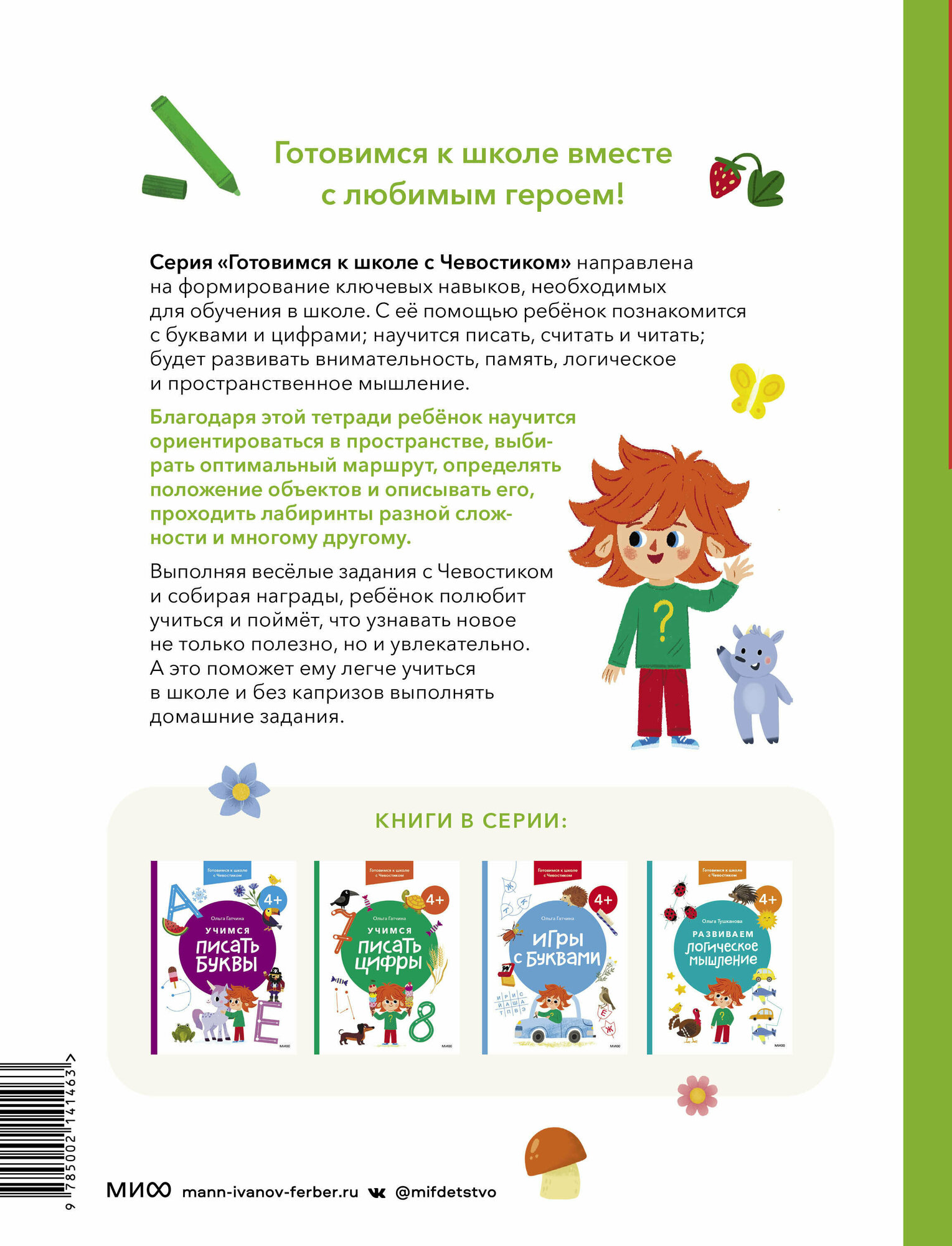 Серия «Готовимся к школе с Чевостиком» направлена на формирование ключевых навыков, необходимых для обучения в школе. С её помощью ребёнок познакомится с буквами и цифрами; научится писать, считать и читать; будет развивать внимательность, память, логическое и пространственное мышление.