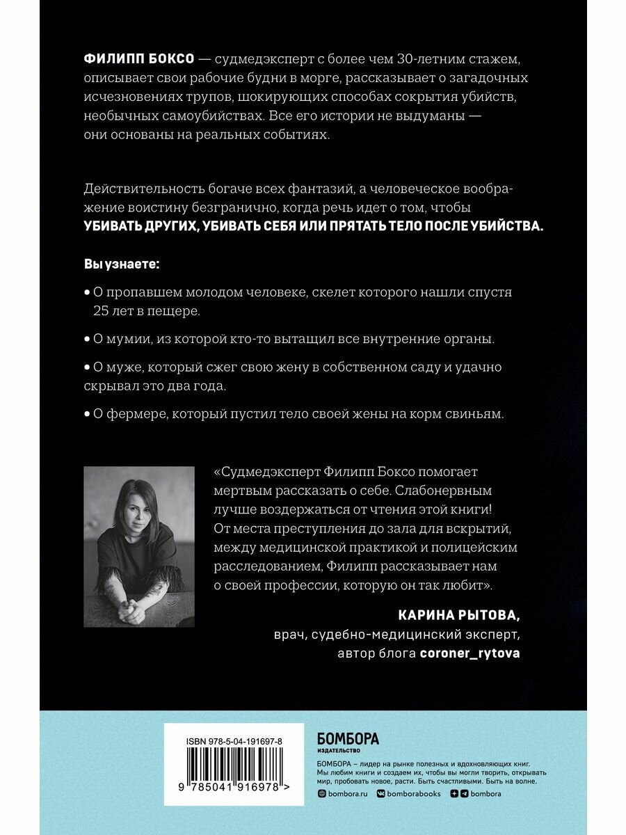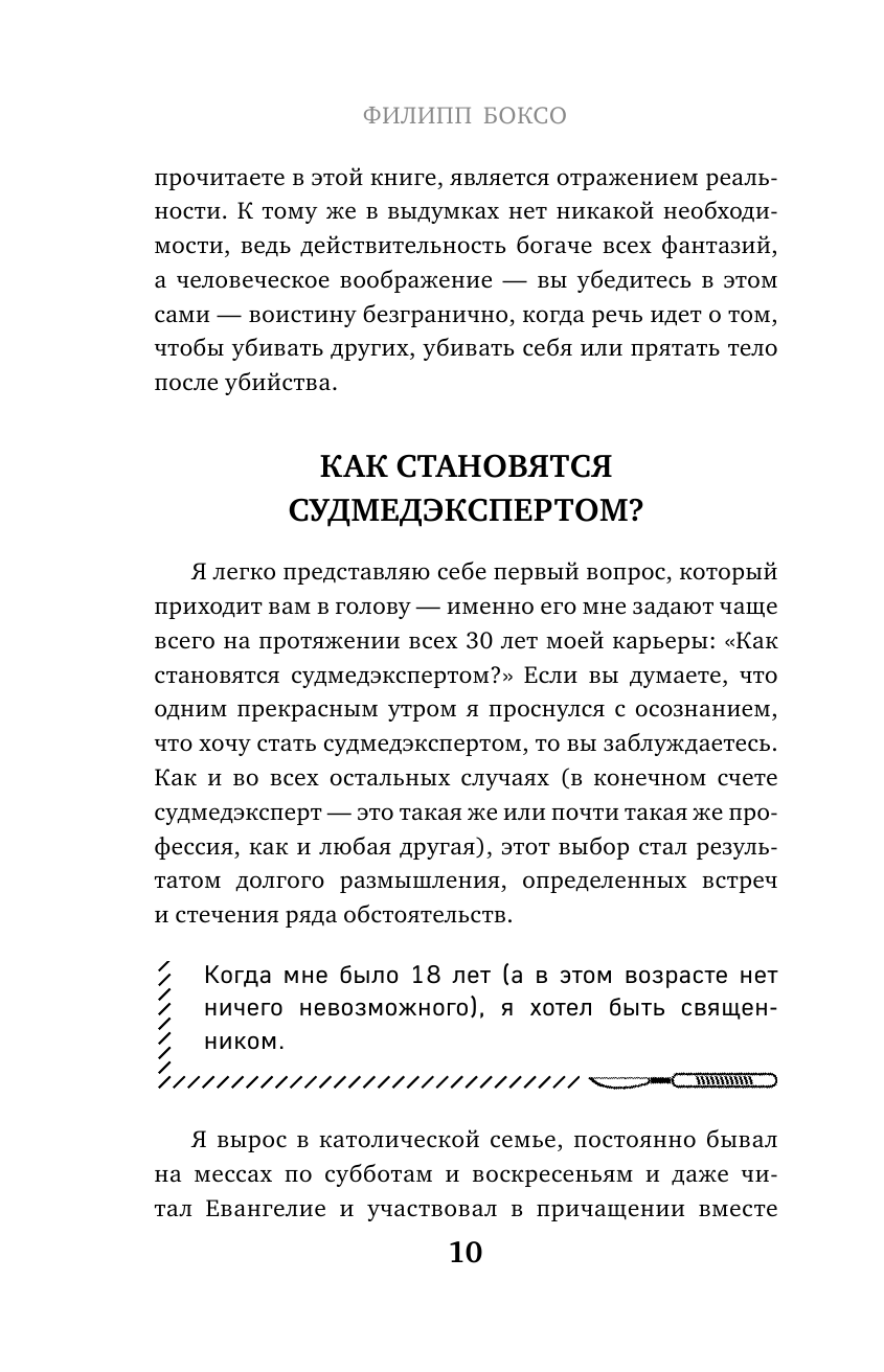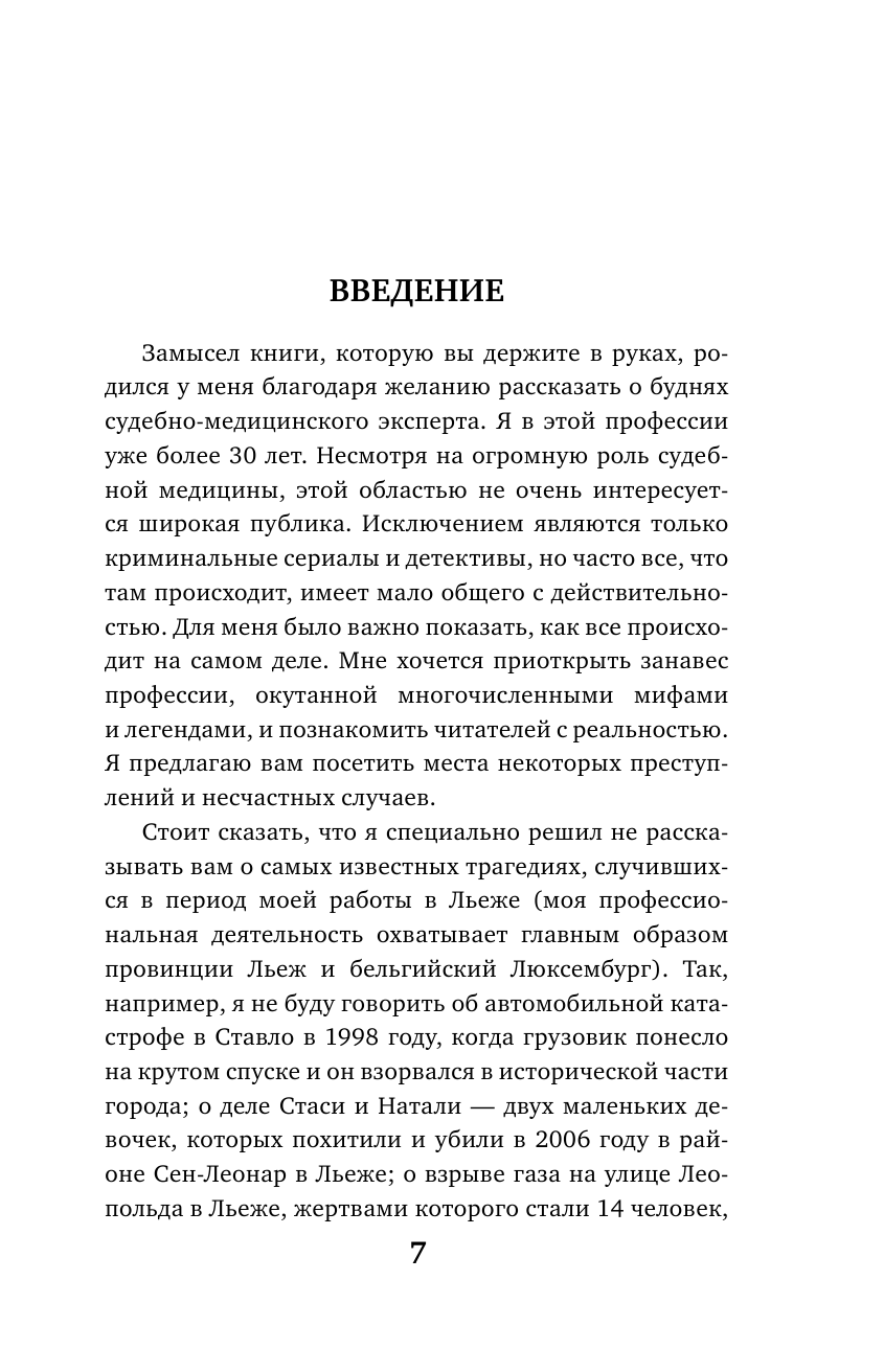 Автор книги Филипп Боксо постепенно вводит нас в мир криминалистики и разоблачает мифы, объясняя, что в действительности происходит на месте преступления, как разлагается тело, почему покойники просыпаются и как самые близкие люди могут убить. Автор расскажет, как он пришел к работе судмедэксперта и почему люди выбирают вскрывать тела покойников. Вы познакомитесь с абсолютно удивительными историями из врачебной практики Филиппа Боксо – судмедэксперта со стажем работы более 30 лет.