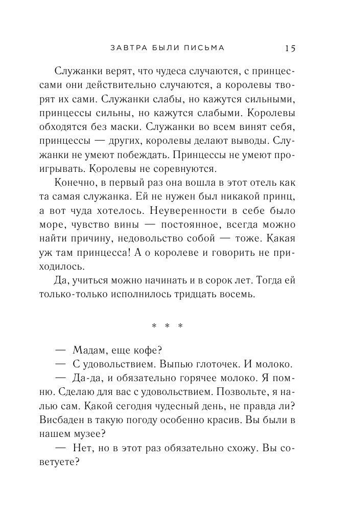 Слава Карелина, писательница и издатель модного журнала о путешествиях, приезжает на Франкфуртскую книжную ярмарку и останавливается в роскошном отеле в Висбадене. Когда-то именно тут начинался ее бурный роман с немецким бизнесменом Норбертом Майером . Славе хочется разобраться в своих чувствах и понять, правильное ли решение она приняла восемь лет назад. Во Франкфурте Слава встречается со своей подругой Ритой. Рита старше, она уже двадцать лет живет в Германии и счастлива. Неожиданно для Славы Рита передает подруге свою переписку. Когда-то у нее был курортный роман, оставивший в ее жизни яркий след…