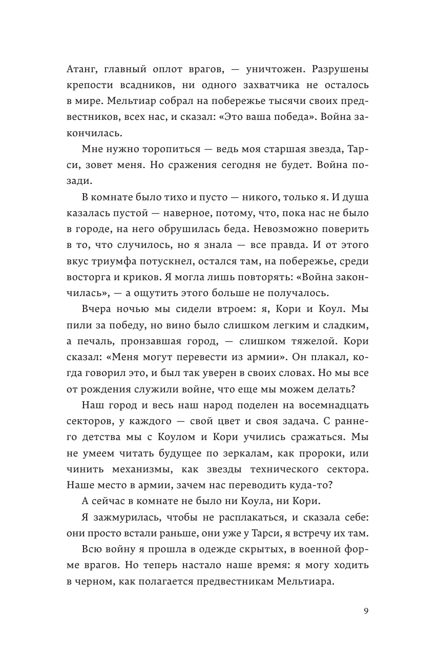 Военное время кончилось, и для темного народа наступила долгожданная эпоха преображения. Но как тем, кто жил ради сражений и победы, найти свое место в меняющемся мире? Мельтиар — бывший предводитель армии; Бета — простой воин, младшая звезда. Они растеряны и страдают от тяжелых потерь. Но вскоре они узнают о древнем пророчестве, которое гласит, что после войны темному народу суждено отправиться в далекий путь. А значит, для предвестников Мельтиара найдутся новые задания.