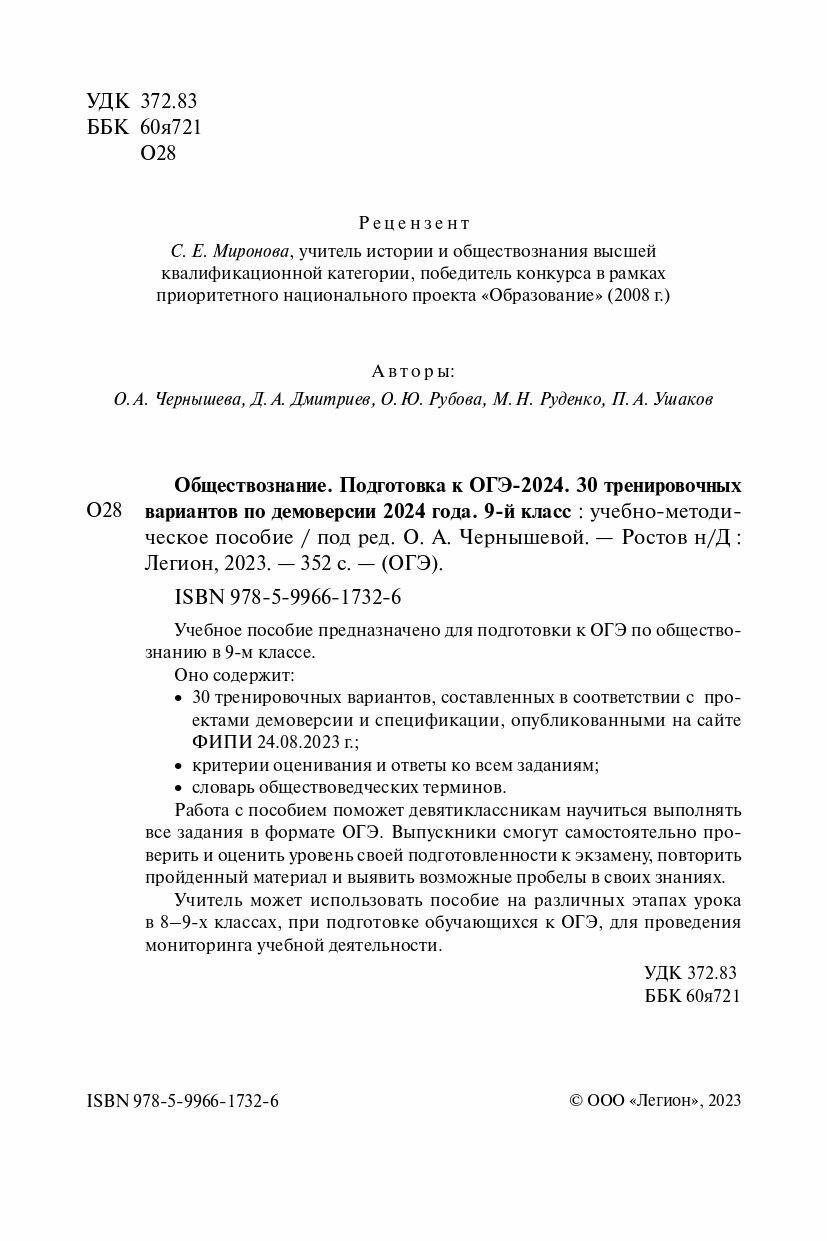 ОГЭ-2024. Обществознание. 9 класс. 30 тренировочных вариантов по демоверсии 2024 года (Чернышева Ольга Александровна, Дмитриев Дмитрий Андреевич, Рубова Оксана Юрьевна); Легион, 2023