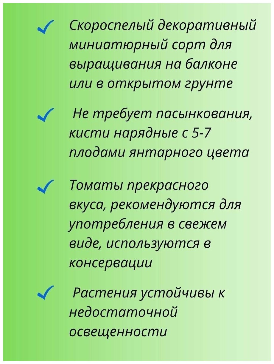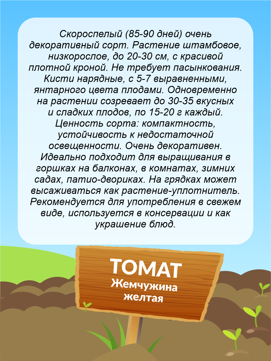 Скороспелый (85-90 дней) очень декоративный сорт. Растение штамбовое, низкорослое, до 20-30 см, с красивой плотной кроной. Не требует пасынкования. Кисти нарядные, с 5-7 выравненными, янтарного цвета плодами. Одновременно на растении созревает до 30-35 вкусных и сладких плодов, по 15-20 г каждый. Ценность сорта: компактность, устойчивость к недостаточной освещенности. Очень декоративен. Идеально подходит для выращивания в горшках на балконах, в комнатах, зимних садах, патио-двориках. На грядках может высаживаться как растение-уплотнитель. Рекомендуется для употребления в свежем виде, используется в консервации и как украшение блюд.