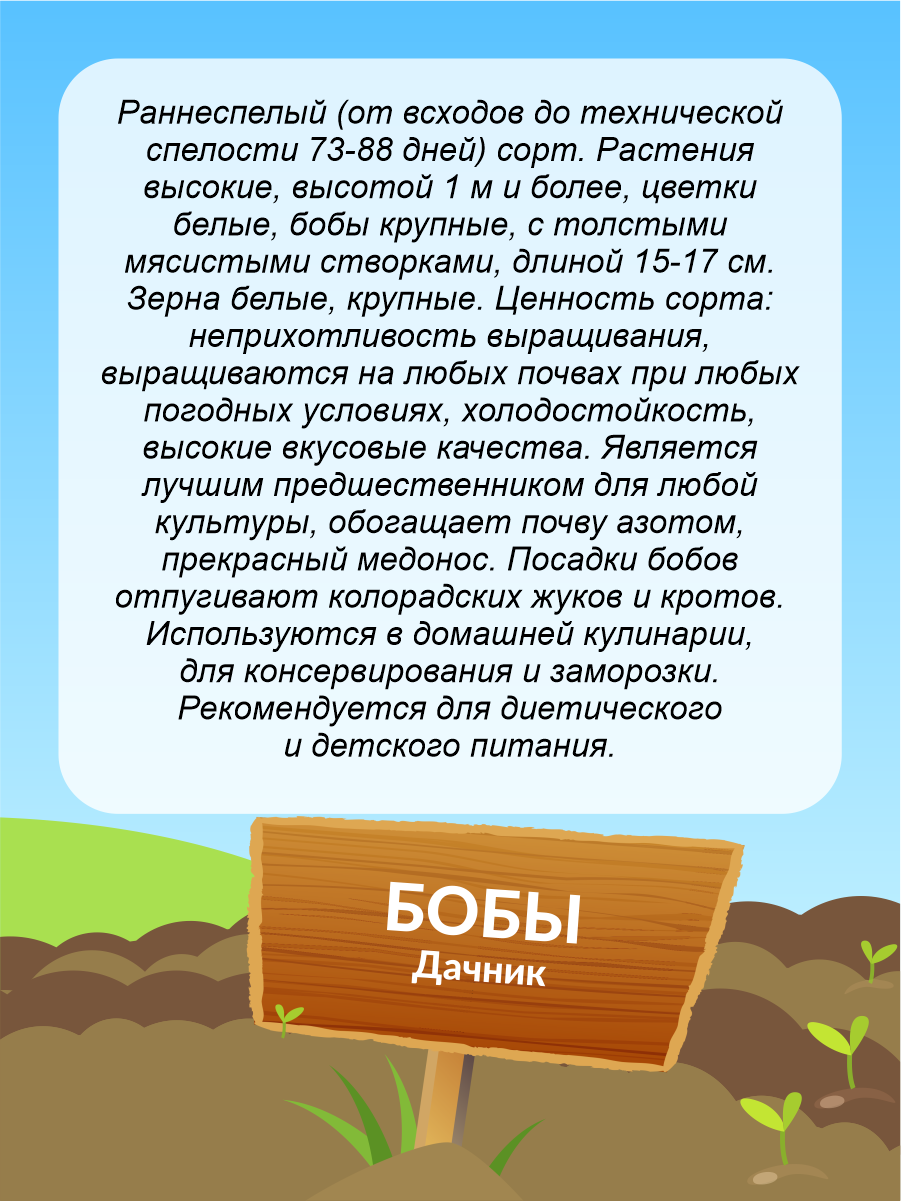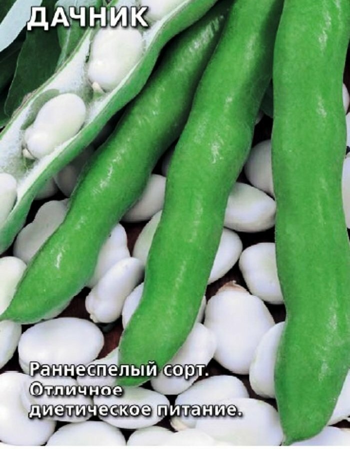 Бобы сорта Дачник во взрослом состояния вырастают на метр в высоту, выкидывая цветки белого цвета, привлекающие много опылителей - традиционно растения такого типа являются хорошими медоносами. Примерно спустя 80 дней после всходов можно снимать урожай - стручки в созревшем состоянии достигают 15 сантиметров. Створки у них мясистые с большой толщиной. Зерна насыщены белком, витаминами, пектином. Урожайность: 600 г на кв.м.