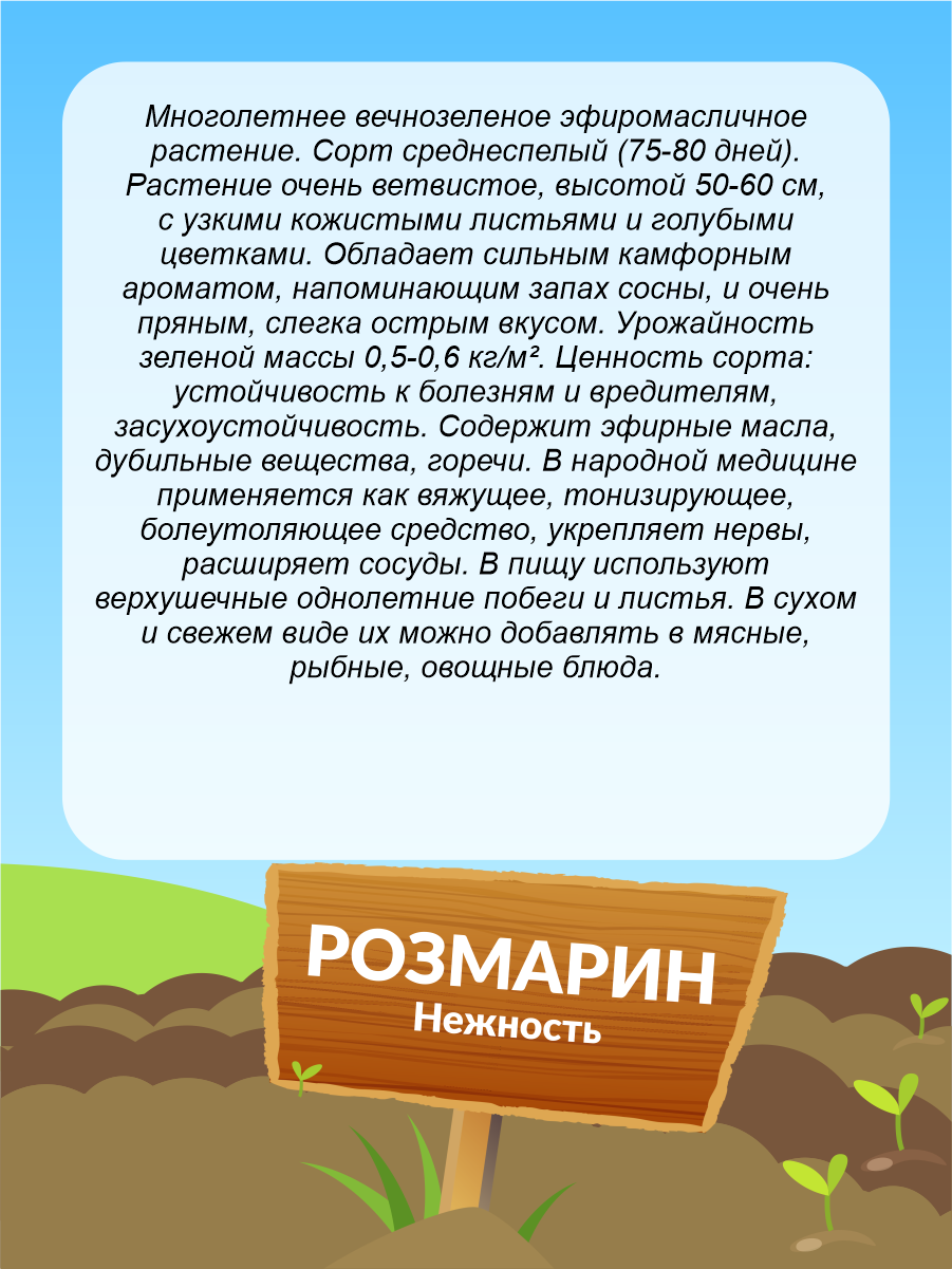 Многолетнее вечнозеленое эфиромасличное растение. Сорт среднеспелый (75-80 дней). Растение очень ветвистое, высотой 50-60 см, с узкими кожистыми листьями и голубыми цветками. Обладает сильным камфорным ароматом, напоминающим запах сосны, и очень пряным, слегка острым вкусом. Урожайность зеленой массы 0,5-0,6 кг/м². Ценность сорта: устойчивость к болезням и вредителям, засухоустойчивость. Содержит эфирные масла, дубильные вещества, горечи. В народной медицине применяется как вяжущее, тонизирующее, болеутоляющее средство, укрепляет нервы, расширяет сосуды. В пищу используют верхушечные однолетние побеги и листья. В сухом и свежем виде их можно добавлять в мясные, рыбные, овощные блюда.
